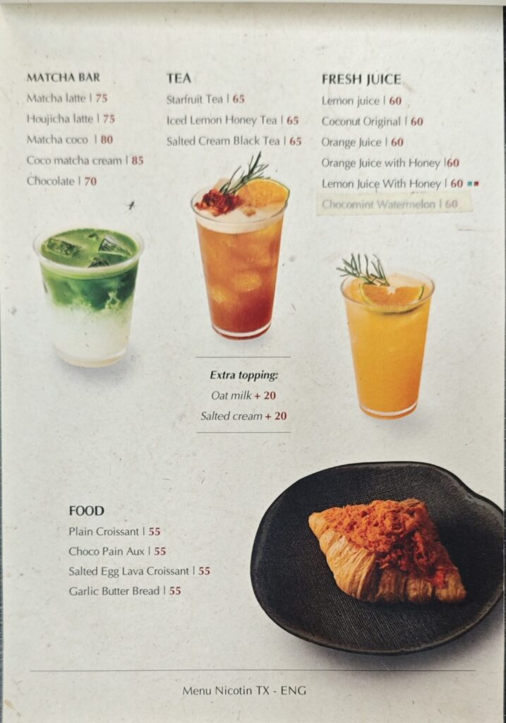 「Nicotin Cafe Ⅲ」のメニューはこちら。コーヒー好きからお茶派まで幅広く楽しめる内容です。