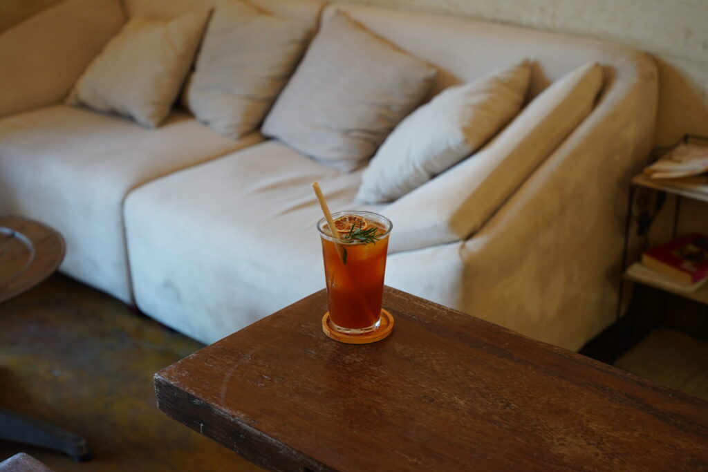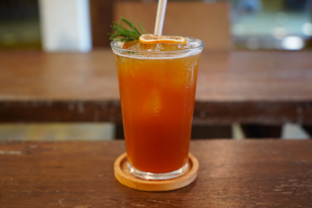 ドライオレンジとフレッシュなローズマリーが添えられた美しい仕上がり。一蜂蜜のまろやかで奥行きのある甘さが広がり、その直後にレモンのきりっとした酸味が全体を引き締めてくれるカンジ。飲むたびに鼻に抜けるローズマリーの香りも良いアクセント。