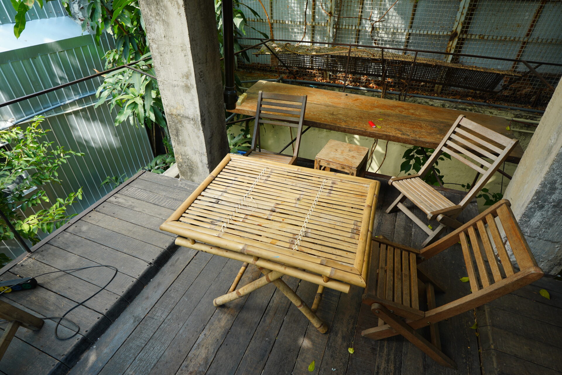 塔の脇にある細い階段を登ると…一段高いロフトのようなデッキ席。周囲の緑を間近に感じられる特等席で、竹編みのテーブルや木の椅子が置かれた開放的な空間です。