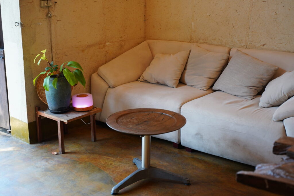 内装の特徴は、素材の質感を巧みに使ったデザイン。壁面は土壁を思わせる温かみのあるベージュで仕上げられ、床のコンクリートの質感とコントラストを描きます。