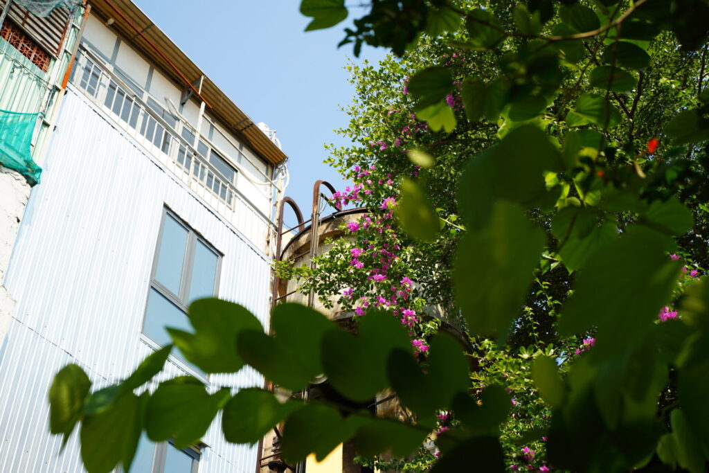 そしてこちらが「Nicotin Cafe Ⅲ」。歴史を感じさせるヴィラの趣をそのまま活かした外観が特徴です。淡い色のコンクリート壁に這うブーゲンビリアのピンクが、南国の強い日差しによく映える。古い建物とイマドキなセンスが溶け合っています。