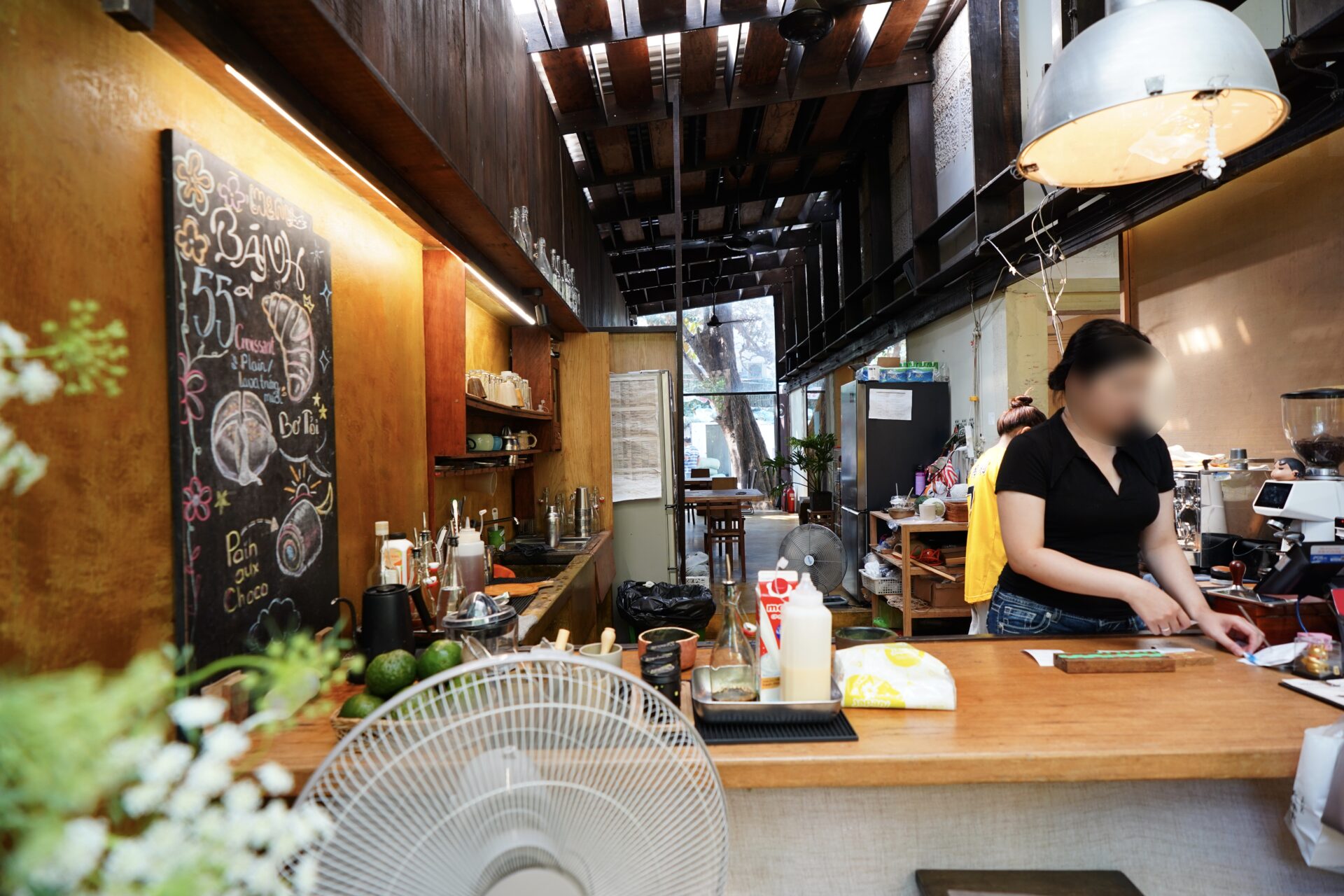店内は屋内席とテラス席からなります。エアコンはありませんが、あちこちで扇風機やシーリングファンが全力で稼働しているので、午前中なら快適。