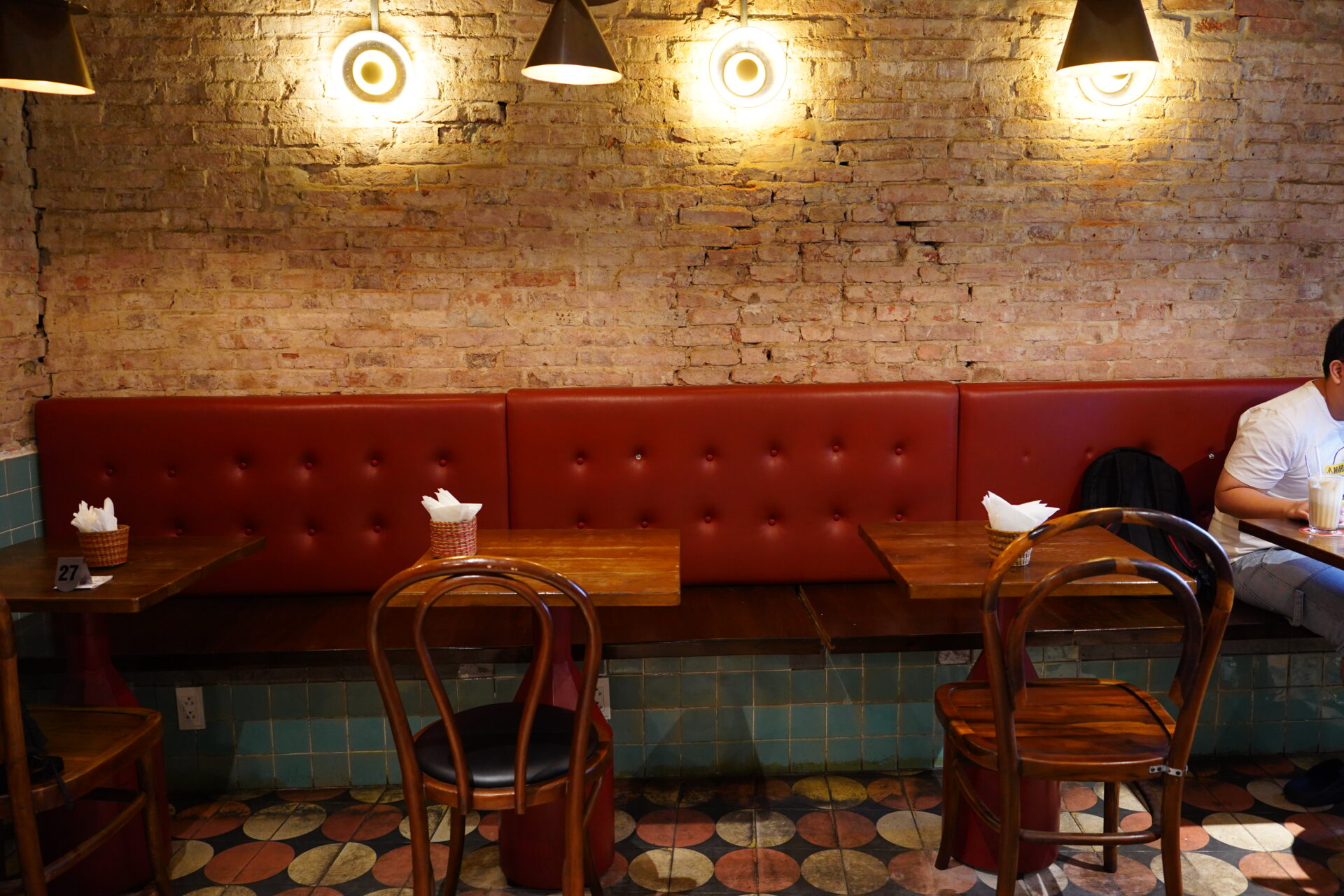 壁の下部やカウンターにあしらわれたエメラルドグリーンタイルがレンガの赤みを引き立て、清潔感と洗練された印象を訪れる人に与えます。