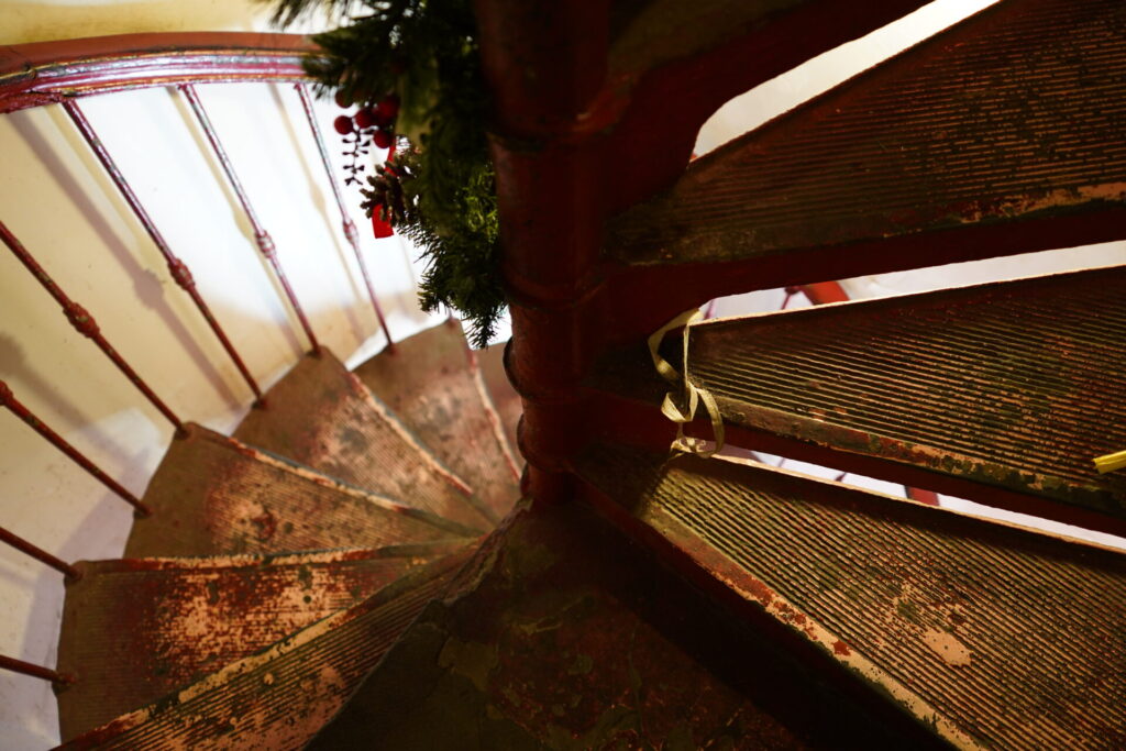 そして現れるのが赤い螺旋階段です。使い込まれて少し色が剥げた鉄の質感が却ってヴィンテージな雰囲気を醸し出しており、一歩一歩昇るたび、喧騒が遠のいていくのを感じます。