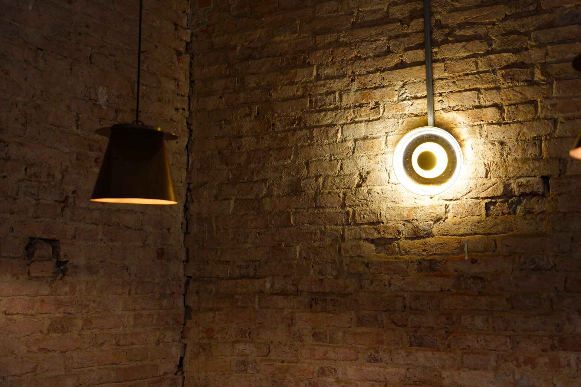 店内を照らすのは、温かみのあるアンバーの照明です。スポットライトがレンガの凹凸を浮かび上がらせ、オトナの雰囲気を演出。