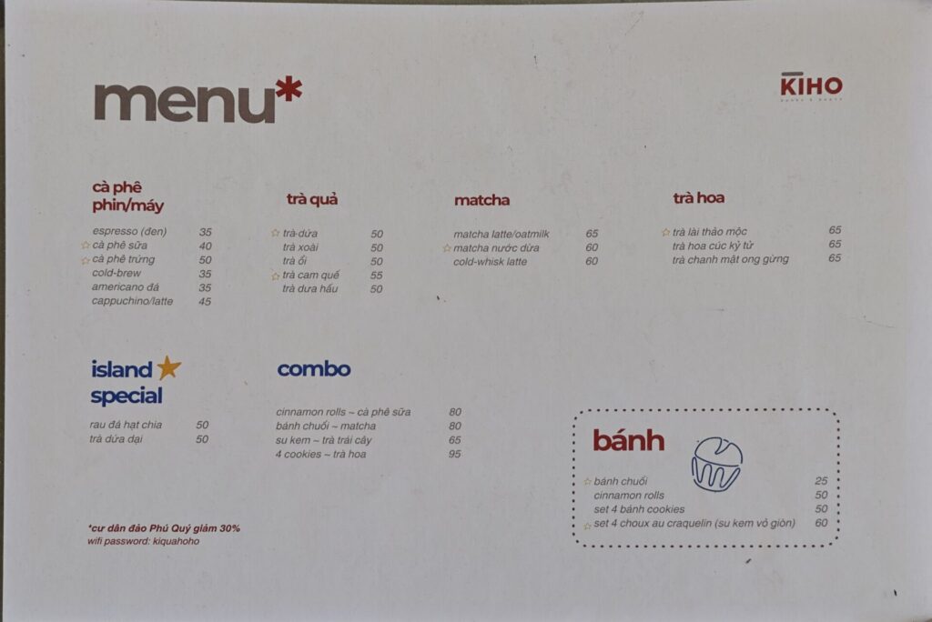 メニューはシンプルで分かりやすく、コーヒー(Phin/Machine)、フルーツティー、抹茶、そして店名にもあるペイストリーが揃っています。島民は30%オフだそう。皆知り合いみたいなもんだし、見分けるのは容易なのだろう…。