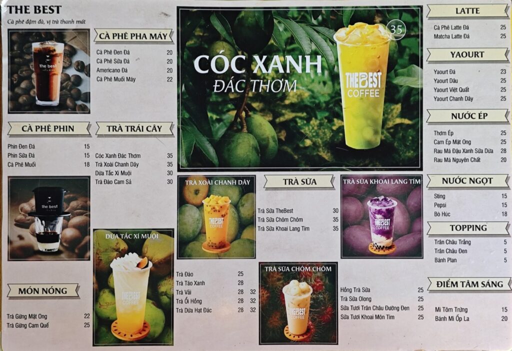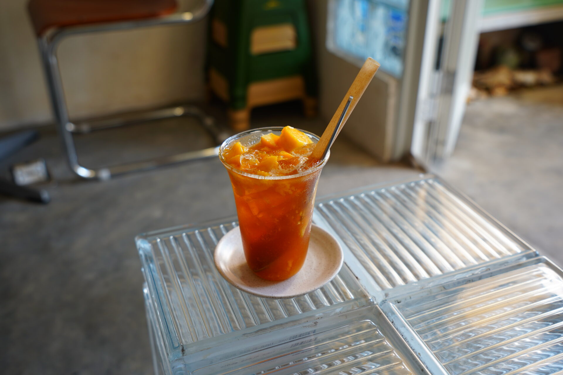 注文したのは「Trà xoài(マンゴーティー)」50,000ドン。驚いたのは、熟したマンゴーがたっぷりトッピングされていたこと。大抵、こういうのに使われるマンゴーって、未熟な青いやつだから…。マンゴーそのものの甘みと、スッキリとした紅茶が絶妙にマッチします。