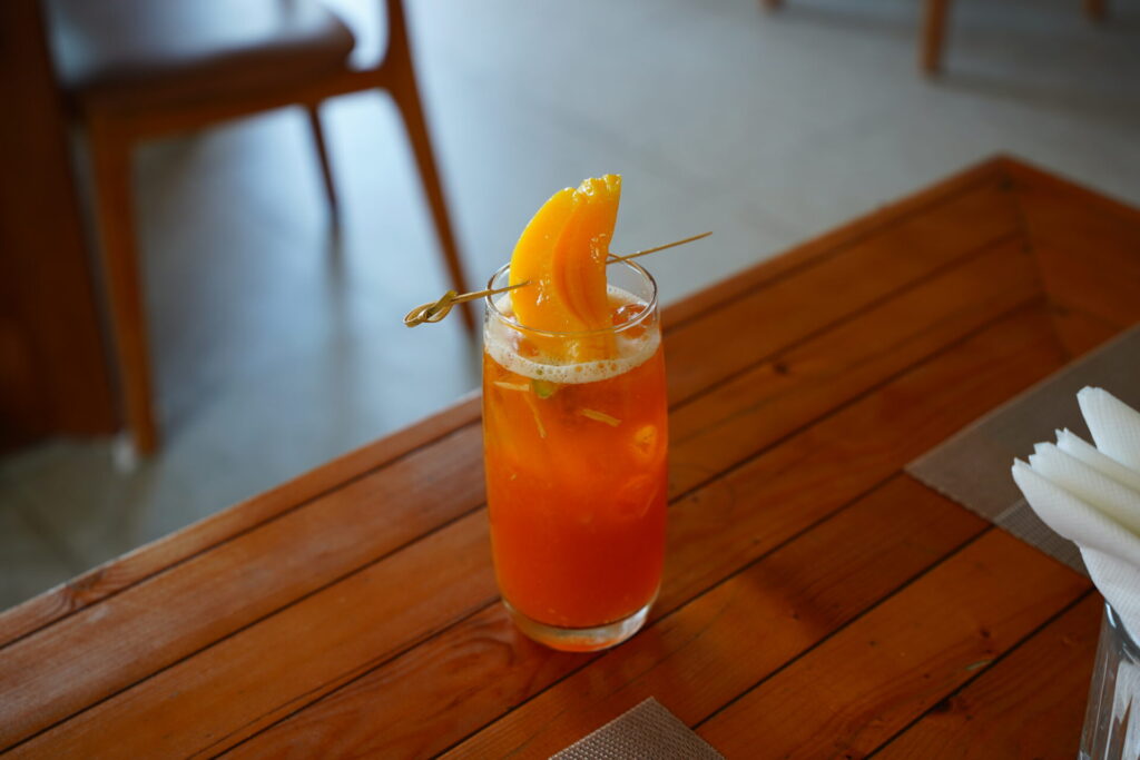 ドリンクは「Trà đào cam sả(ピーチオレンジレモングラスティー」65,000ドン。ベトナムのカフェの定番ですが、こちらのはプレゼンテーションも非常に綺麗。