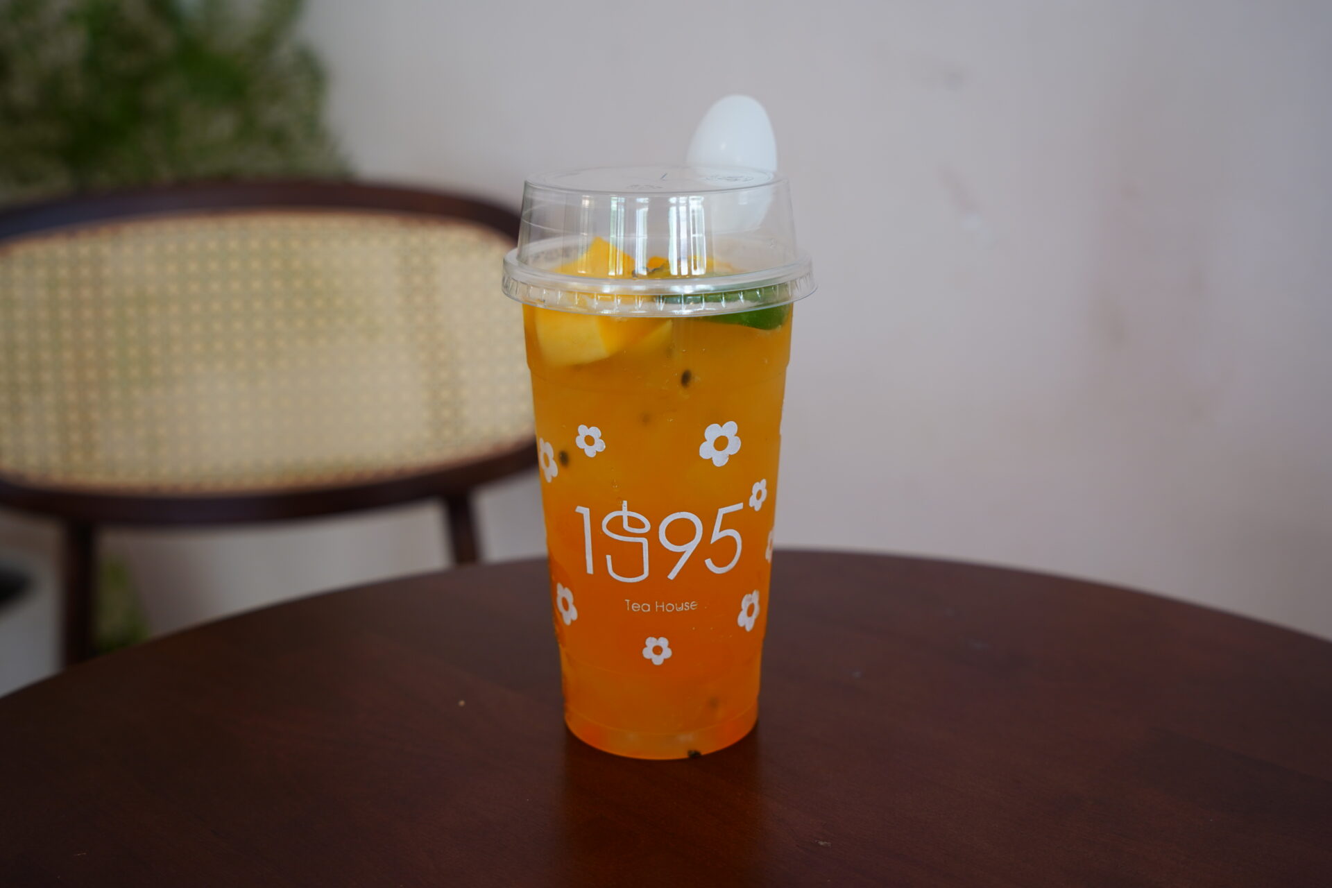 「Trà xoài chanh dây(マンゴーパッションティー)」 35,000ドン。可愛らしいお花さんと「9」をカップに見立てたロゴがあしらわれたカップで提供される一杯。