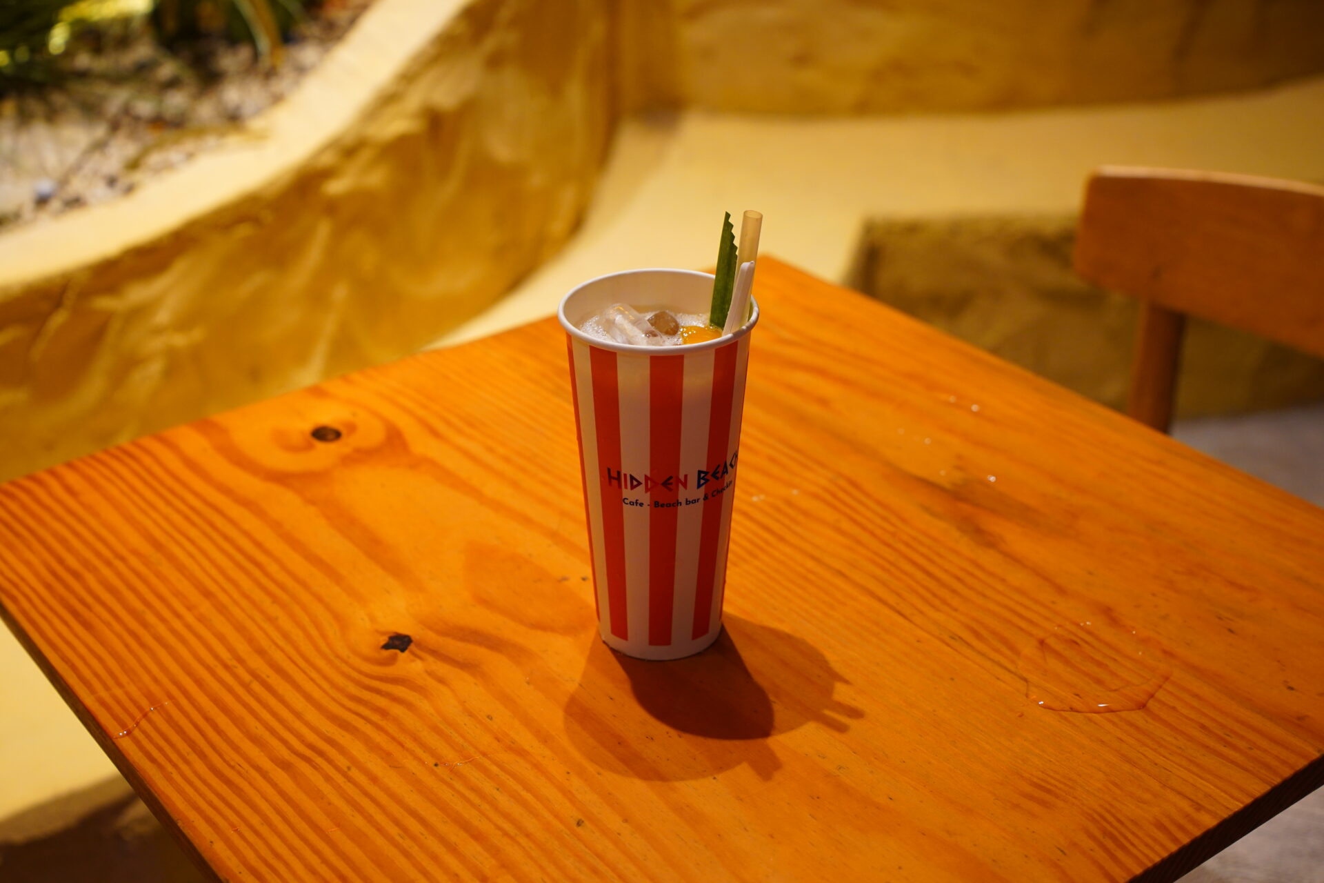 注文したのは「Trà đào cam sả(ピーチオレンジレモングラスティー) 」75,000ドン。やっぱり映え代込みなカンジ?ストライプ柄のポップなカップも、店内のネオンカラーに映えて非常にフォトジェニック。テーブルに水滴がべっとり付着していたので、拭き掃除はしてほしいな…。