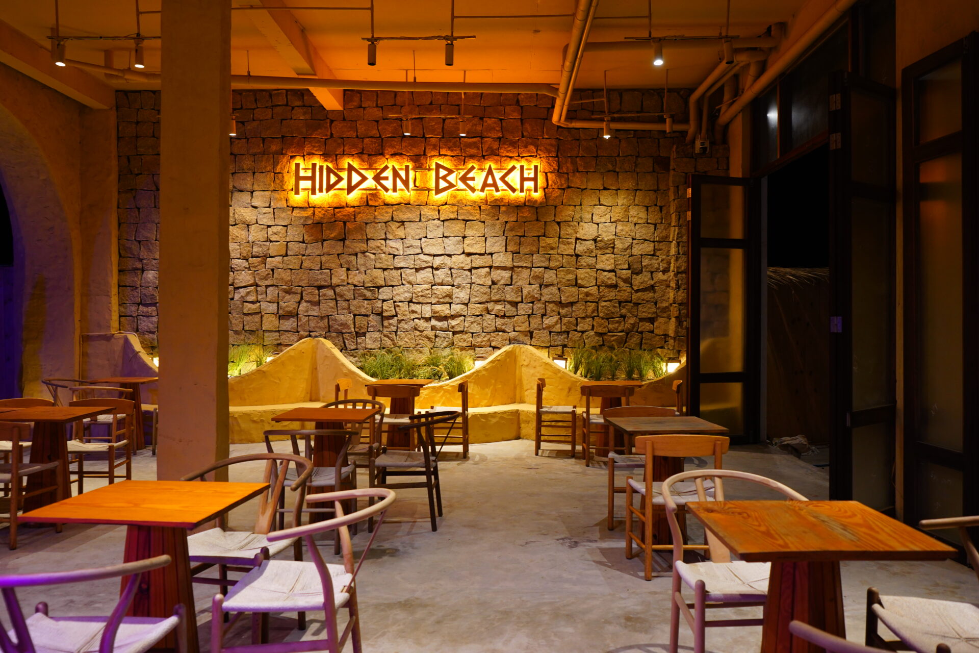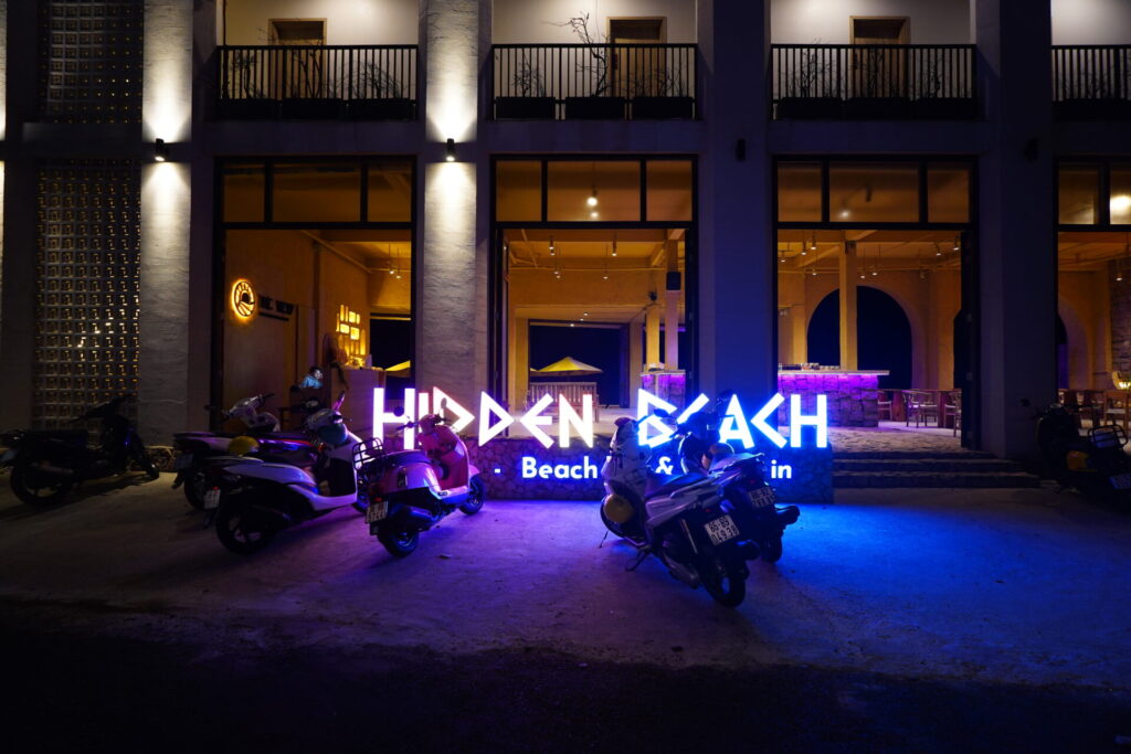 カウンターバーを照らす鮮やかなパープルのライティングは、どこか近未来的なエッジが効いており、石壁に浮かび上がる「HIDDEN BEACH」のロゴが、夜の特別感を演出。
