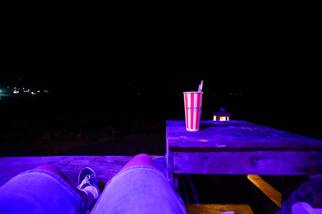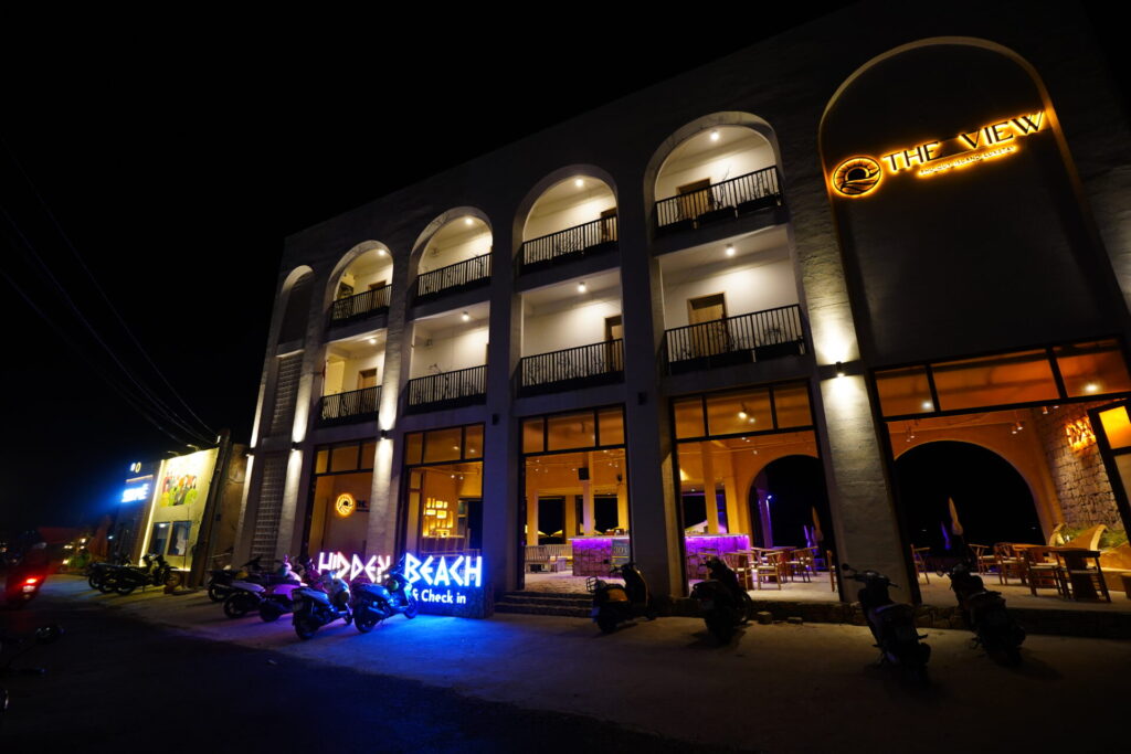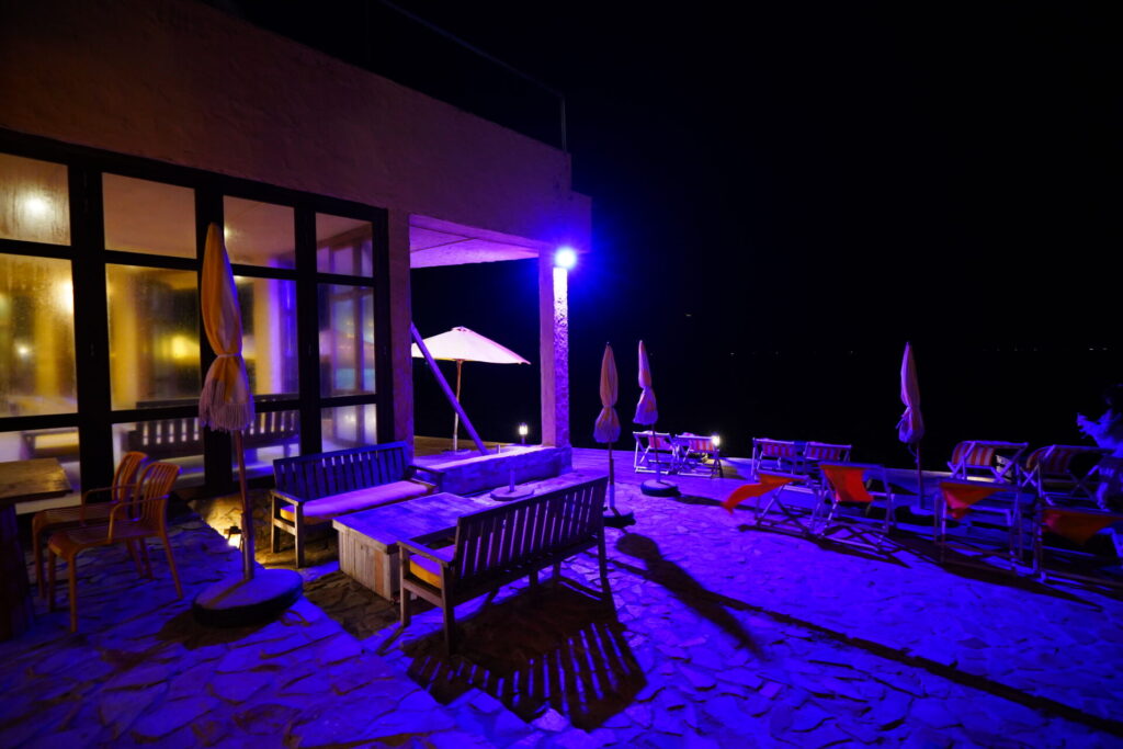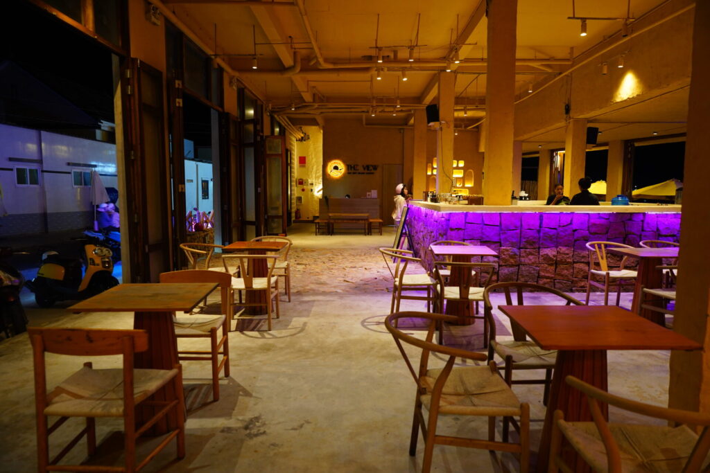 ここはブティックホテル「THE VIEW」に併設された、「カフェ、ビーチバー、チェックインスポット」を謳う複合的な空間。夜に訪れると、紫や青のネオンが灯る遊び場へと姿を変えます。