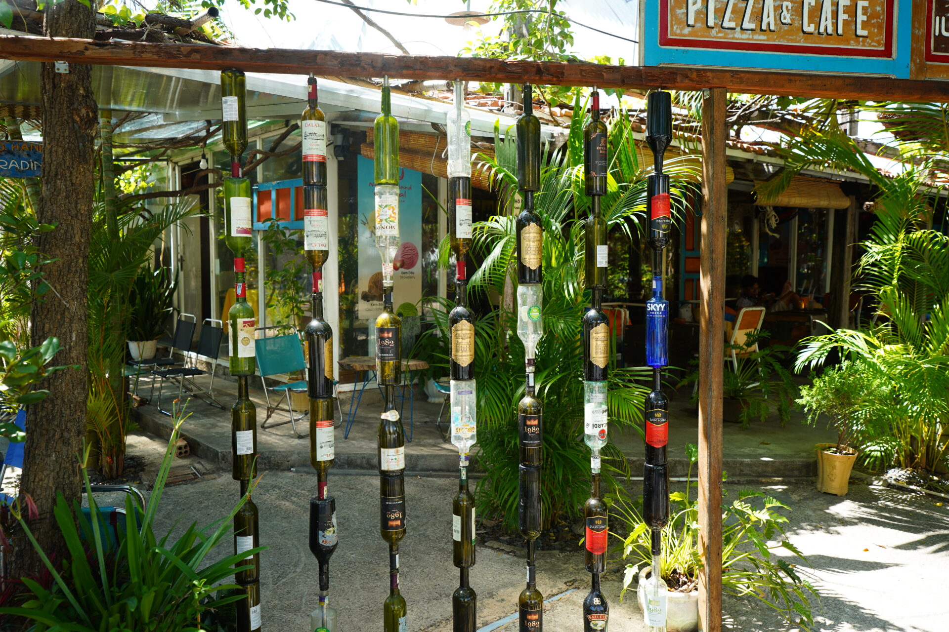 入り口横に設置された空きワインボトルのディスプレイが印象的。木漏れ日がガラスを透過してきらめく様子が食事への期待を高めてくれます。