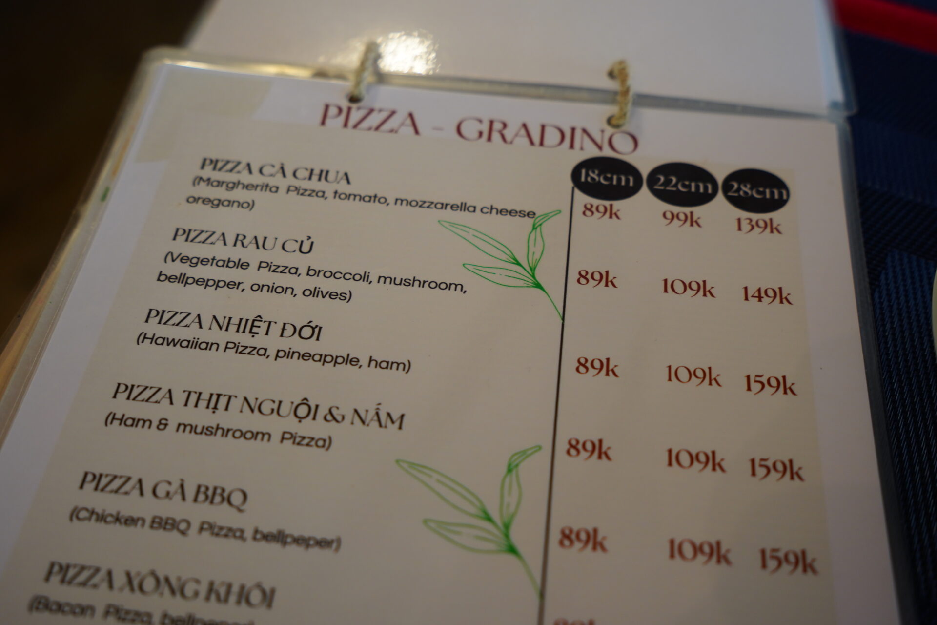 ピザは18cm、22cm、28cmの3サイズ展開となっており、一人からグループまで用途に合わせて選べる配慮がなされています。価格帯も非常に良心的で、パスタが59Kから、ピザも89Kから。地方都市の物価最高〜。