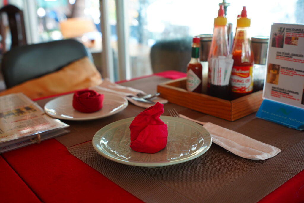 テーブルに目を向けるとカラフルなクロスが敷かれ、布ナプキンがバラの花のように折られて用意。テーブルごとに色を分けているところに拘りが伺える。ヴィンテージな空気感ときちんと感のギャップが面白いですね。