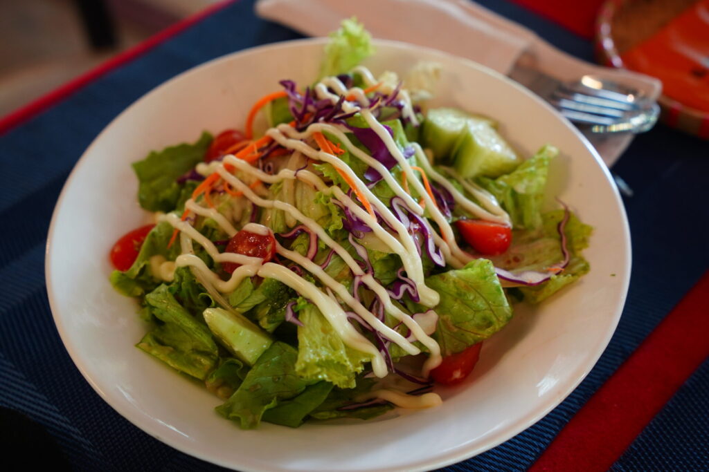まず運ばれてきたサラダは、レタス、紫キャベツ、トマト、キュウリがこんもり盛られ、そのボリュームに圧倒。ドレッシングはバルサミコベースのものに加えてマヨネーズがかかっています。マヨネーズはローカルでよくある甘いやつ。