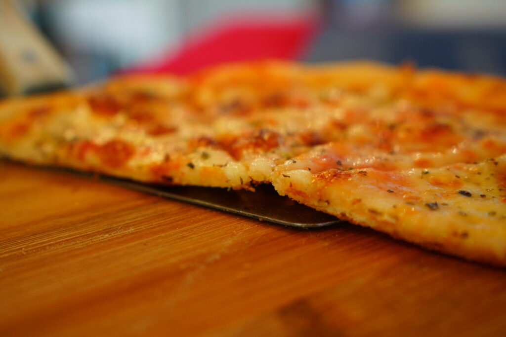 縁はこんがりと焼き上げられ、噛むとサクッ軽快な音が響きます。底面が強めに焼き固められているため、一切れを持ち上げても具材がこぼれ落ちることはありません。冷凍ピザのような、良い意味でチープな感じ。おやつ感覚でペロリといただけちゃいます。
