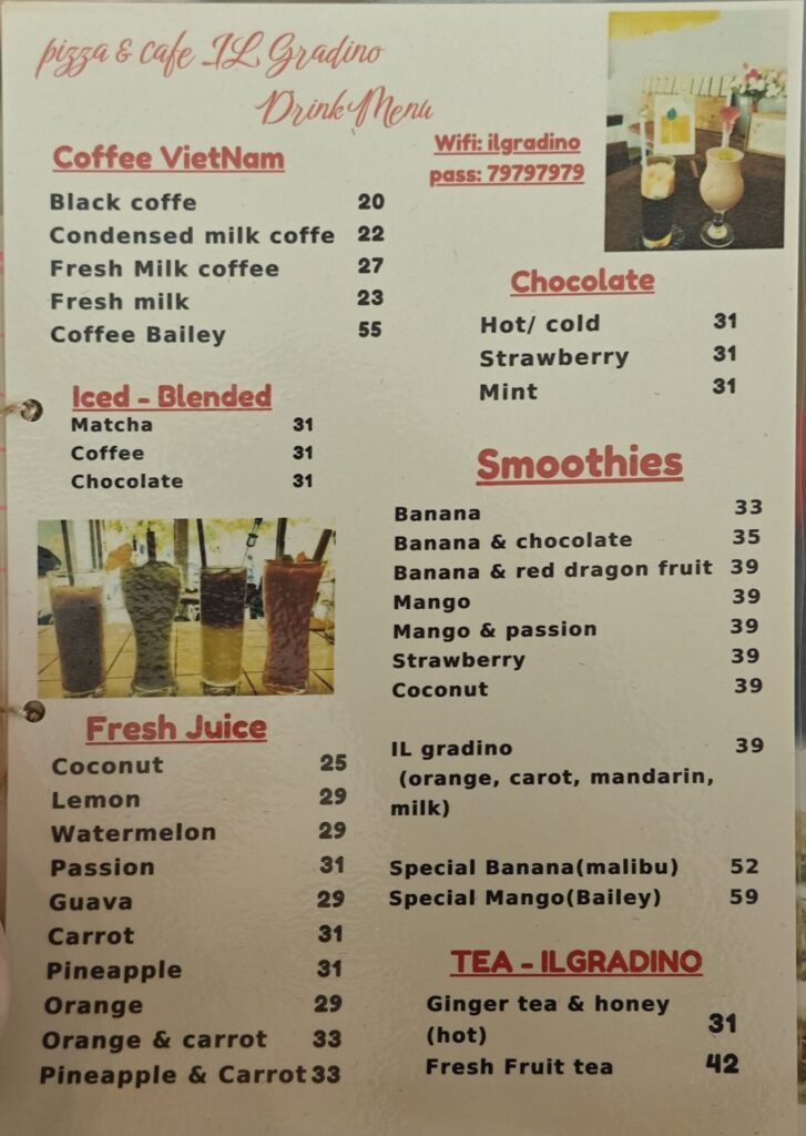 ドリンクメニューも充実しており、ベトナムコーヒーからスムージー、カクテル、ワインまで揃っています。食事だけでなく、カフェとして利用する地元の人が多いように見えました。