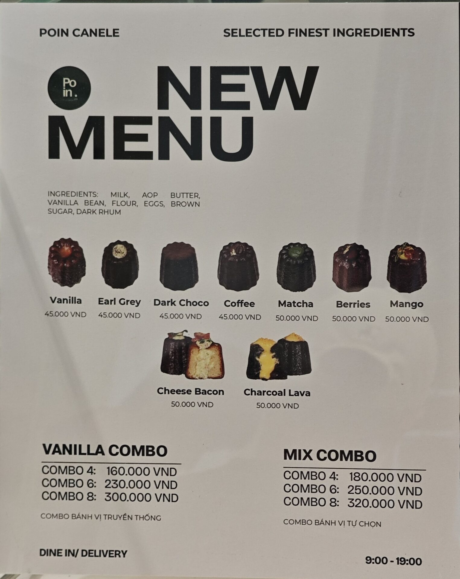 ということで、「Poin Canelé」のメニューはこちら。AOPバター(※認証済みの高品質バター)やタヒチ産バニラビーンズ、ダークラムなど、最高級の素材を使用しています。