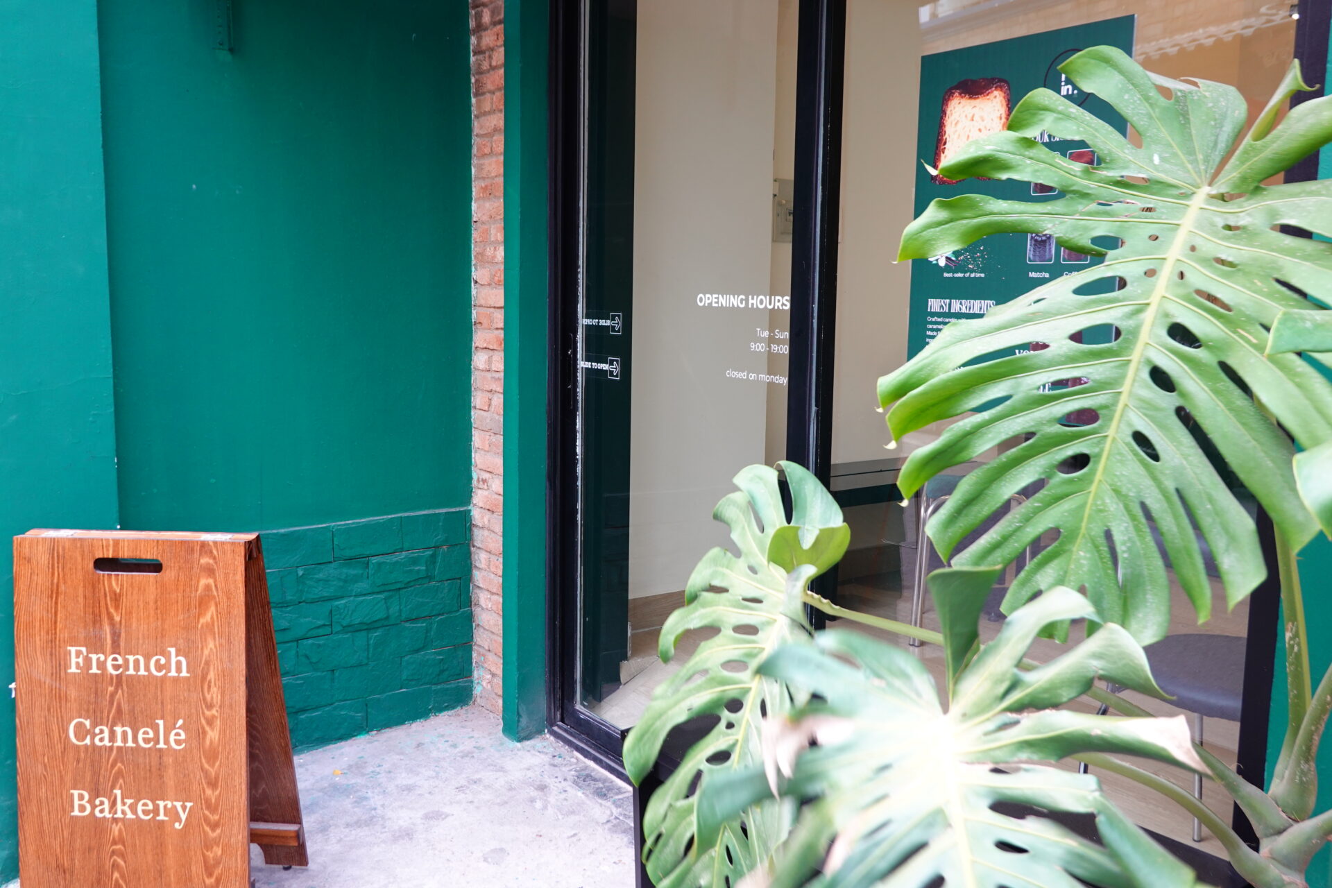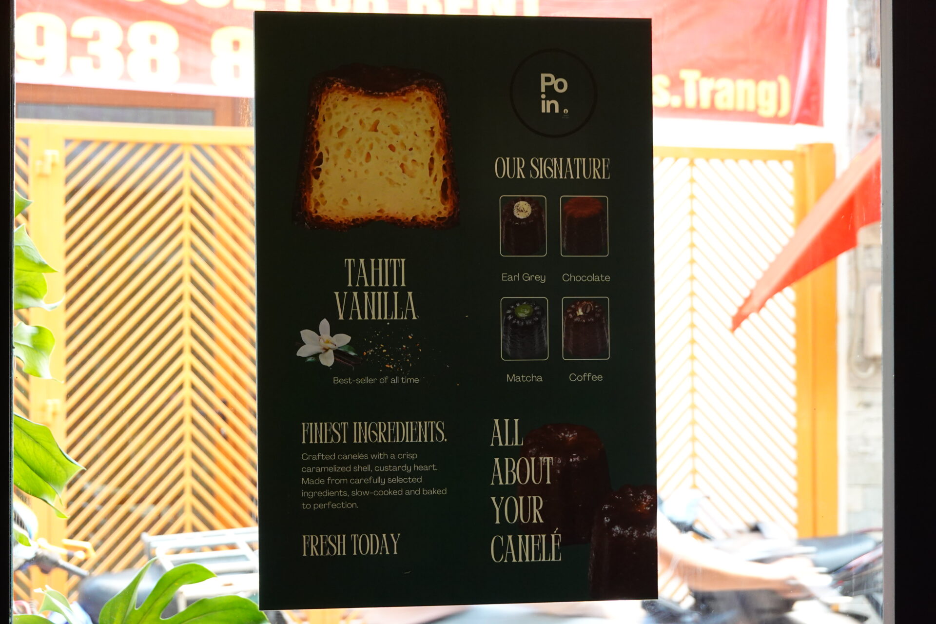 そんな通りの一角で、深いグリーンの外壁と温かみのある赤レンガが目を引く「Poin Canelé」。