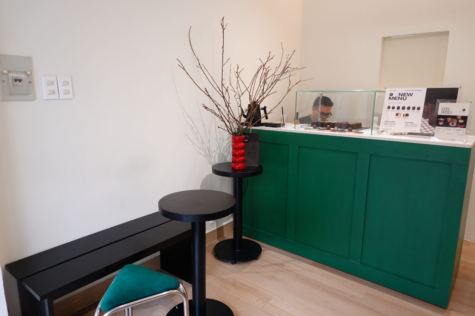 扉を開けて店内に入ると、外観とリンクしたフォレストグリーンがアクセントになったミニマルな空間が。カウンター越しには、宝石のように並ぶカヌレを間近で選ぶことができ、店内の随所には枝物が飾られています。