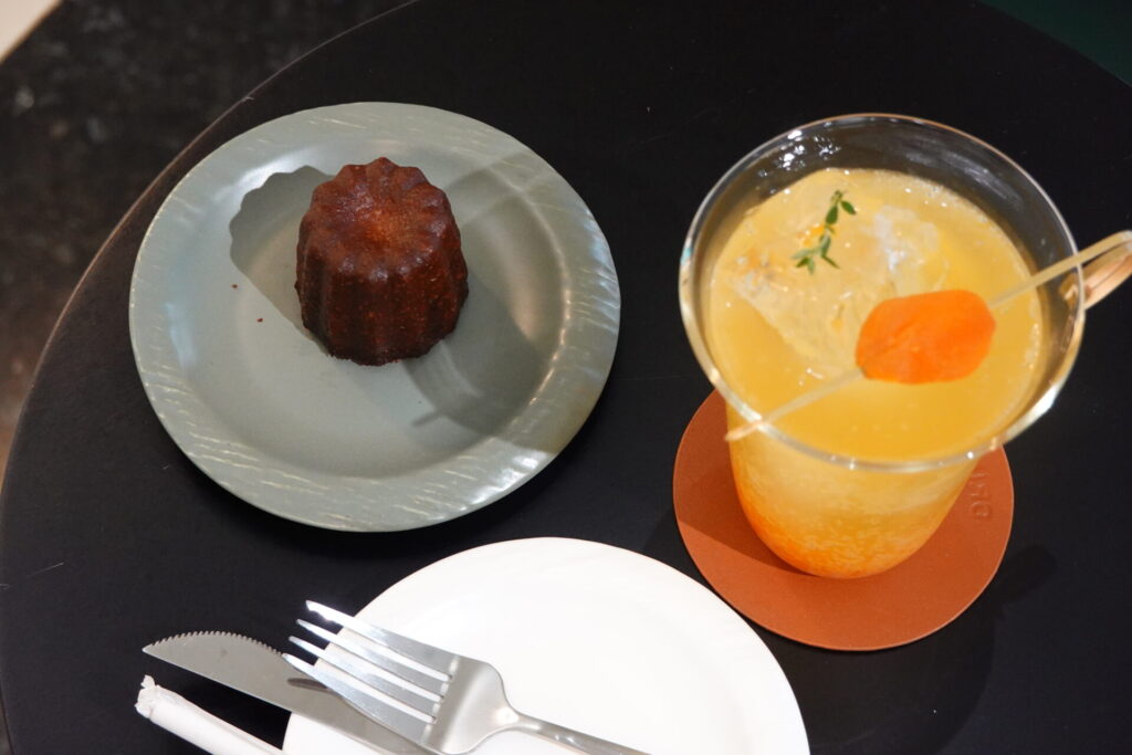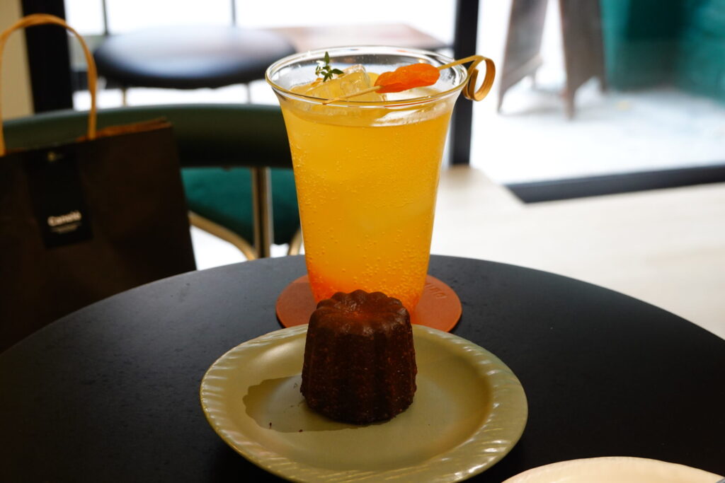 ペアリングに選んだアプリコットのスパークリングドリンクは、チアシードのプチプチ感と程よい酸味がカヌレの濃厚なバニラの余韻をさっぱりと整えてくれます。素晴らしい計算だった(自画自賛)。