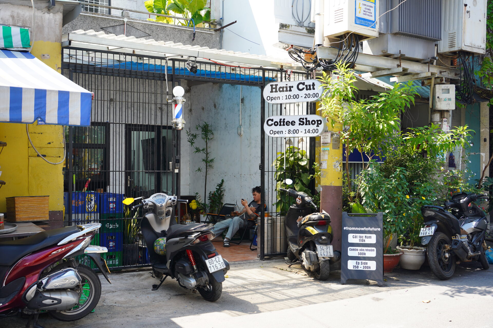 ほんのわずかに開けた道へと出ました。屋台、八百屋、カフェ…人びとの生活が息づく小路です。聞こえてくるのは、どこかの家から漏れる話し声や調理の音。これぞベトナム。