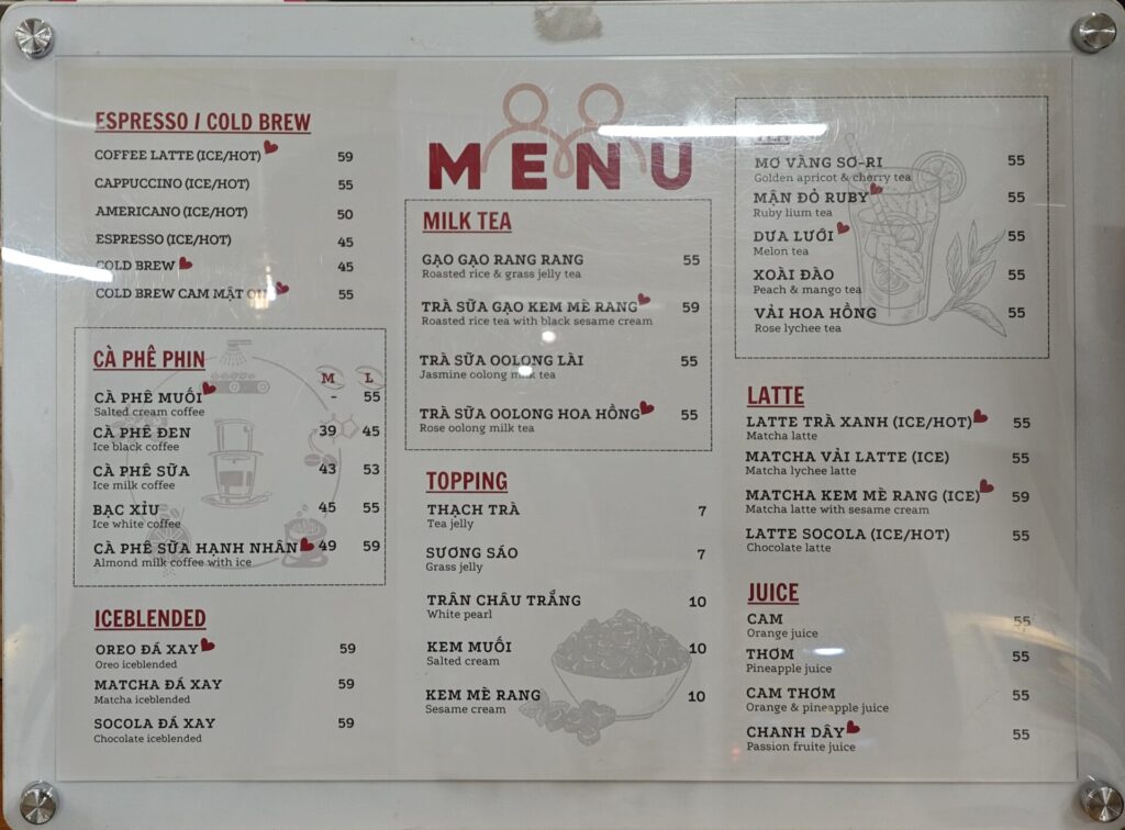 ドリンクは、Cà Phê Sữa(コンデンスミルクコーヒー)や、近年人気のCà Phê Muối(塩コーヒー)といったベトナムらしい一杯は当然のこと、アメリカーノ、ラテなどのエスプレッソ系、コールドブリューまで、コーヒー好きには嬉しい品揃え。ミルクティーやフルーツティー、フレッシュジュースまで、選択肢は豊富です。