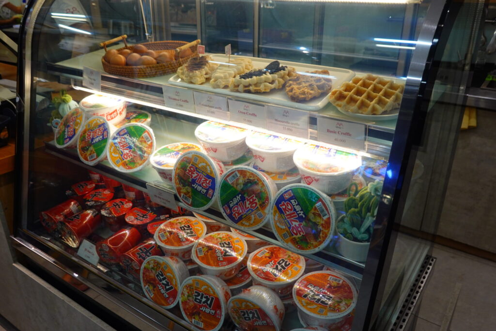 フードメニューもあります。おやつにぴったりのワッフルやクロッフルが並ぶその下で異彩を放っているのが、ずらりと陳列された韓国のカップラーメン。24時間営業カフェならではの、小腹を満たしてくれるラインナップですな。