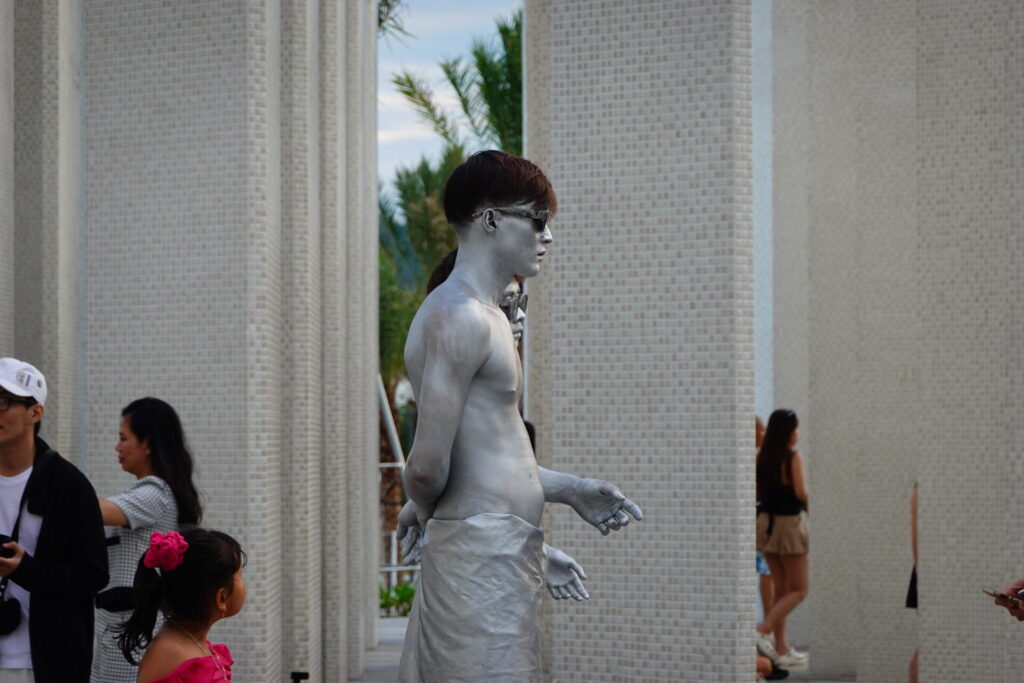 人が集まるところに行商人、フリーのカメラマン、そしてパフォーマーあり。全身に銀粉を塗布し銅像のように静止しています。