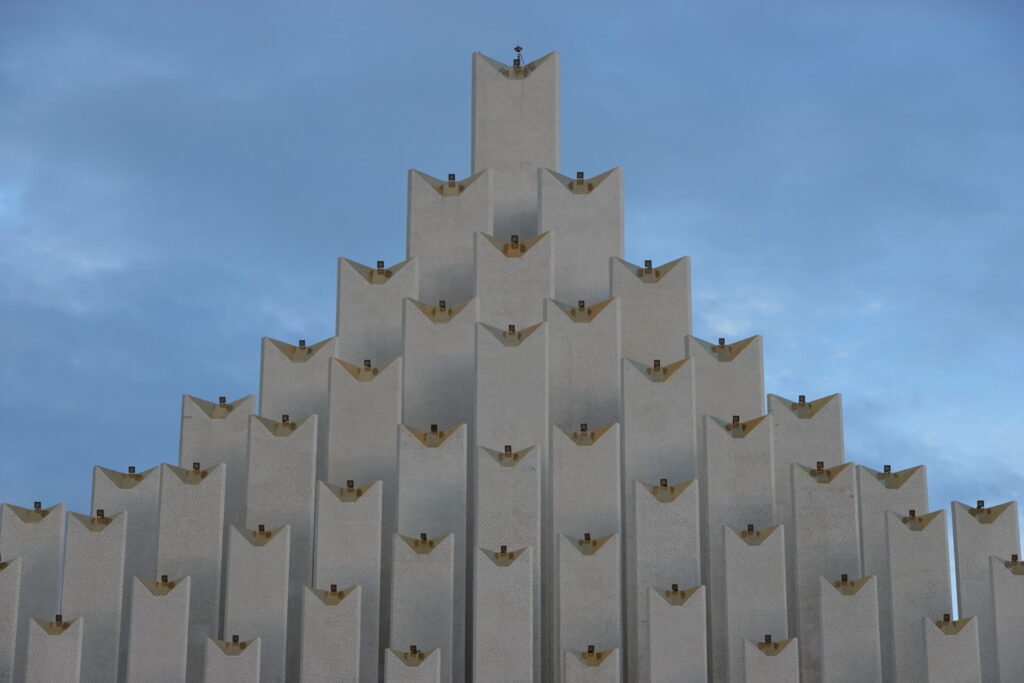なにはともあれ、まずはその大きさに圧倒されます。最も高い柱は30メートル以上あるとのことで、柱の間を歩くと巨大な神殿に迷い込んだような気分に。表面には真っ白なモザイクタイルがびっしりと貼られており、太陽の光を浴びてはギラついている。