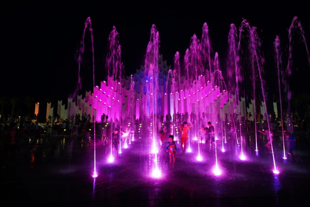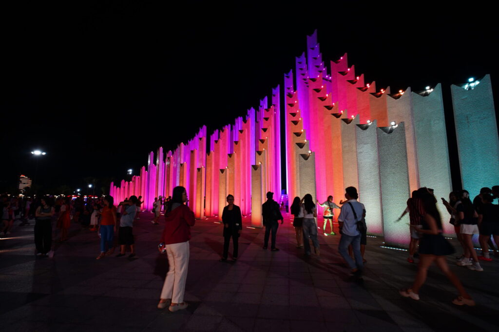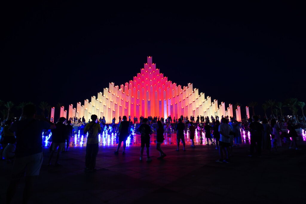 日が沈むと、広場はエンターテイメント空間へと姿を変えます。夜7時頃になると、143本の柱がピンクや青、紫といった色とりどりの光でライトアップされ始め、あたりは一気に幻想的な雰囲気に。