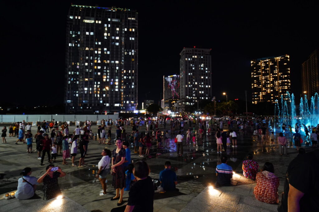周りでは、家族や恋人たちが階段に腰掛けてショーを眺めたり、夜風に吹かれながらおしゃべりに興じたり。この開放的でピースフルな夜の雰囲気もまた良いですね。