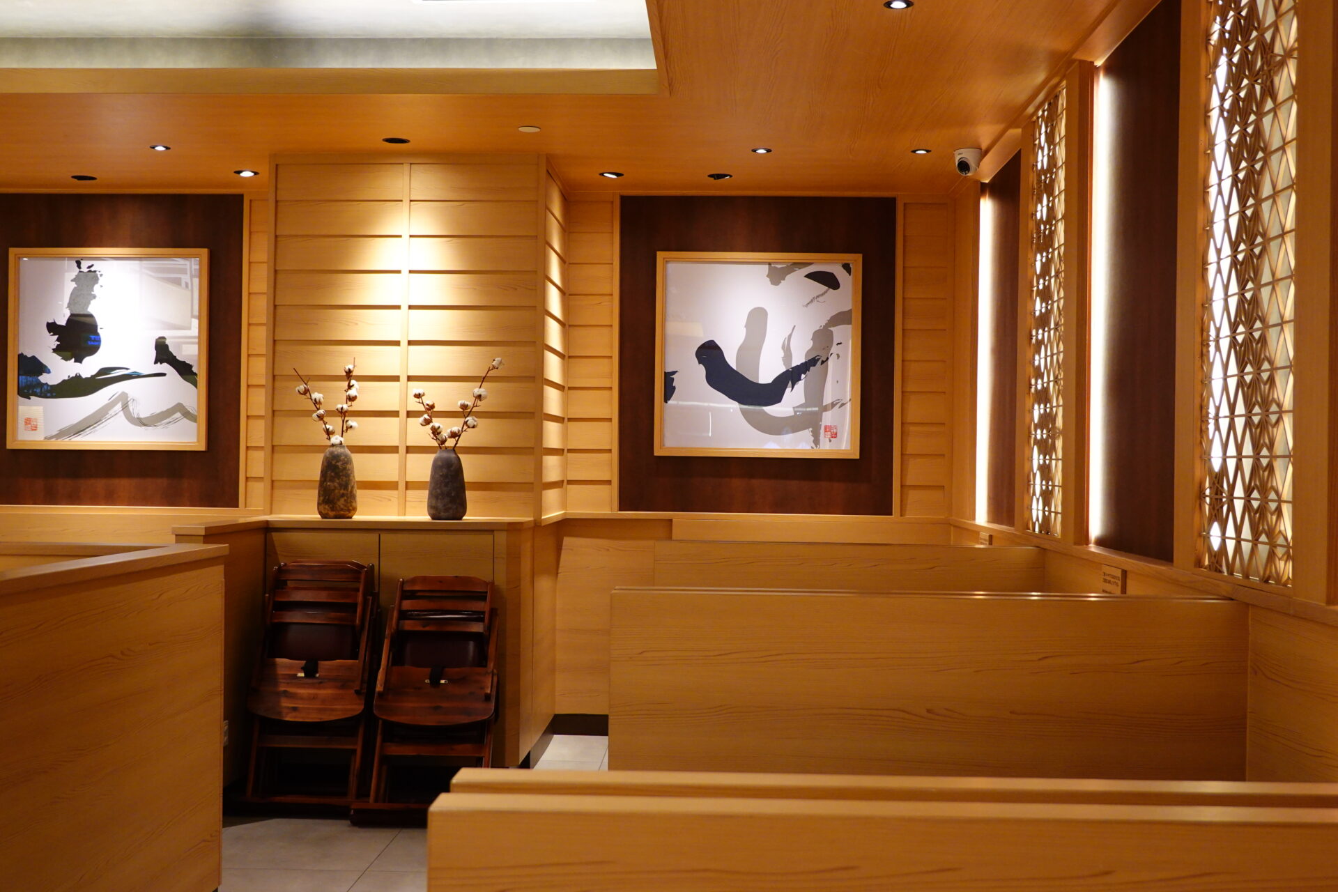 お店の外観は、白木をふんだんに使用した明るく清潔感のあるデザインで統一。壁面には組子を思わせる幾何学模様の装飾があしらわれており、モダンでありながらも格調高い「和」の雰囲気を醸し出している。やはり1号店だけあって気合が入っているようです。