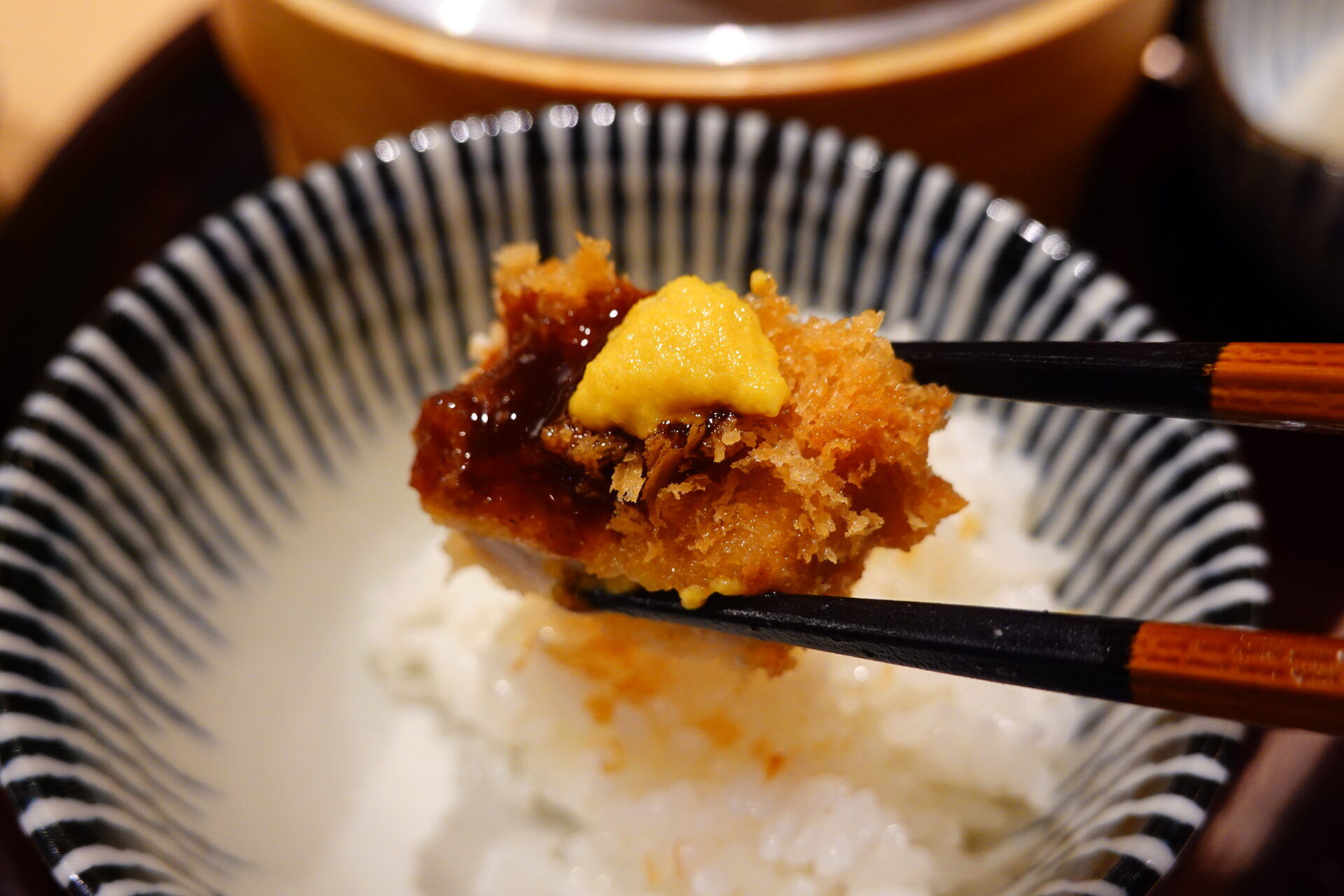 濃ゆい黄色をした、ねっとりとしたテクスチャー…これだけで質の良いからしを使用していることがわかりますね。濃厚なソースの甘みと、ツンと鼻に抜けるからしの刺激。これぞとんかつ、という力強い味わいは、やはり釜炊きご飯との相性が最高やで…。