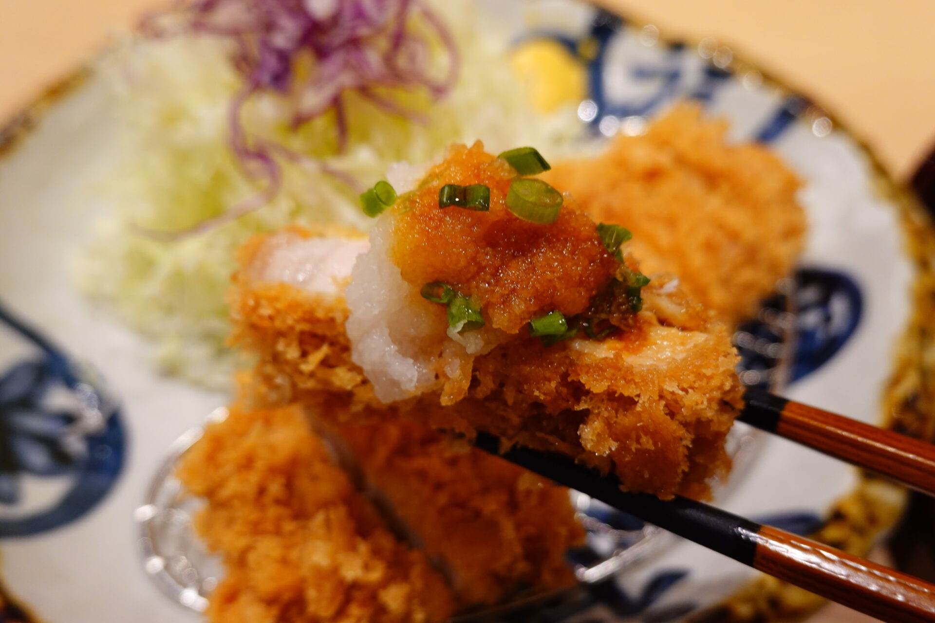 で、メインのおろしロースかつ。たっぷりの大根おろしとネギが入った小鉢に、ポン酢ベースのタレを注ぎ、カツに乗せていただきます。