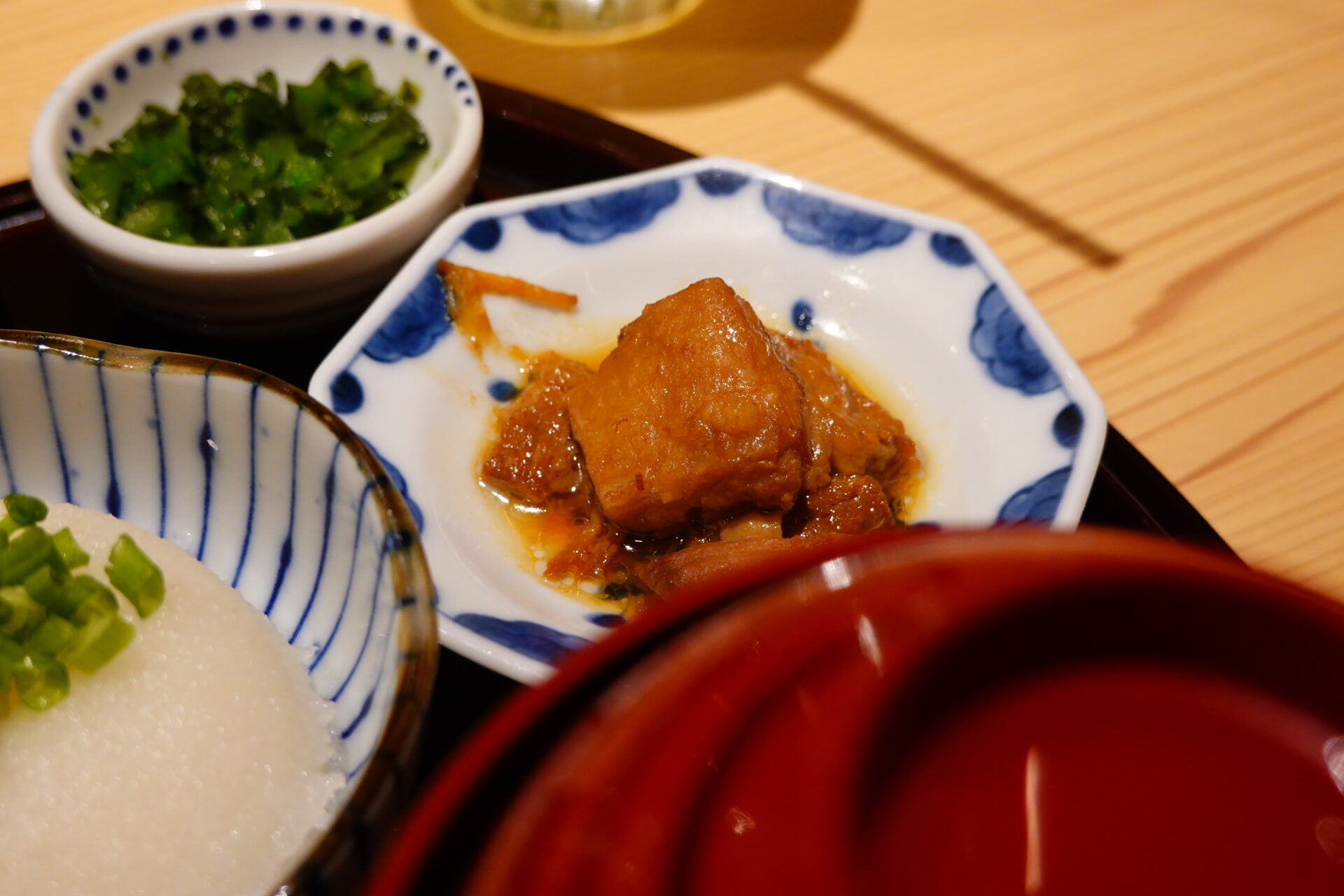 なお、定食には刻み漬物と、小鉢として豚肉の角煮が添えられていました。この角煮もほろほろで、これ単体でもメインを張れるくらいの実力。一口でお椀半分くらいのご飯は食べられるほどです。