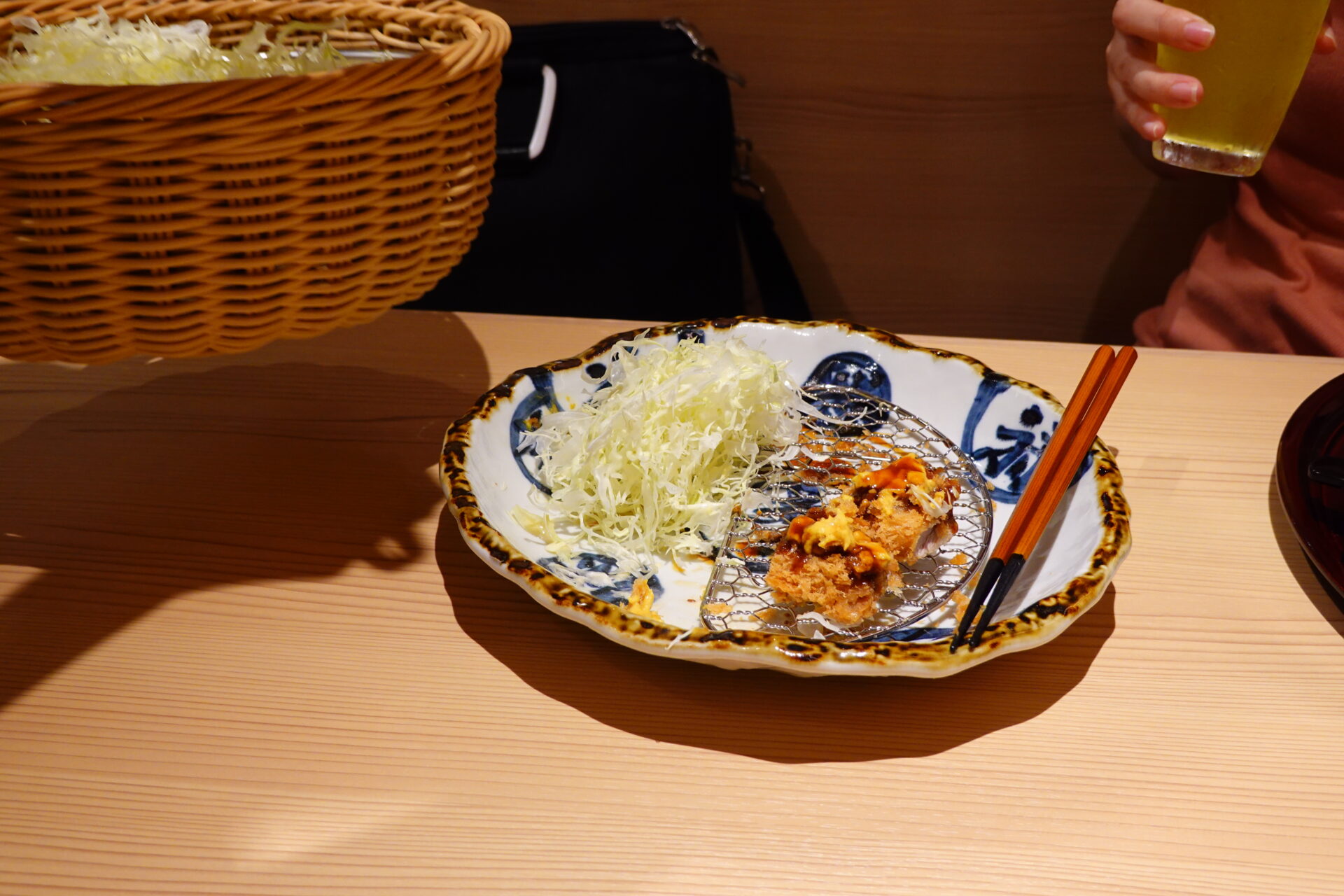 粗めの生パン粉をまとい、こんがりと黄金色に揚がったカツ。ご丁寧に1切れだけをひっくり返した盛り付けでの提供ですが、肉汁がキラリと光るそのさまは見るからにジューシー。
