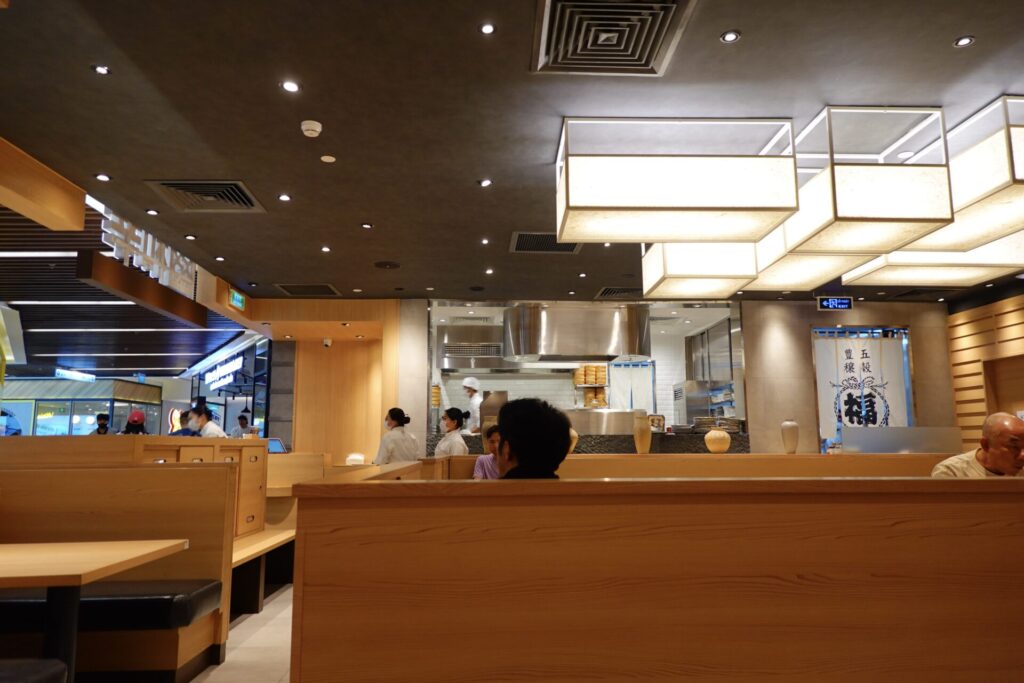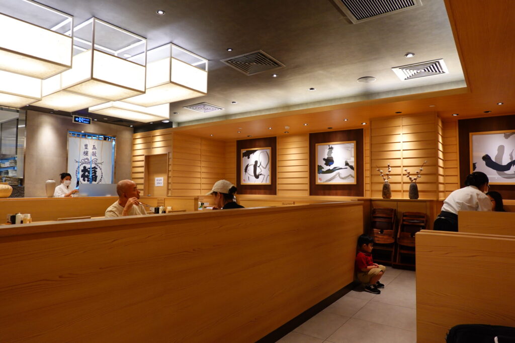 内装も外観同様、明るい木目調で統一されており、温かみがありつつも凛とした清潔感が漂いますね。天井には和紙の行灯風の照明が整然と並び、柔らかい光がテーブルを照らし、落ち着きを与えています。