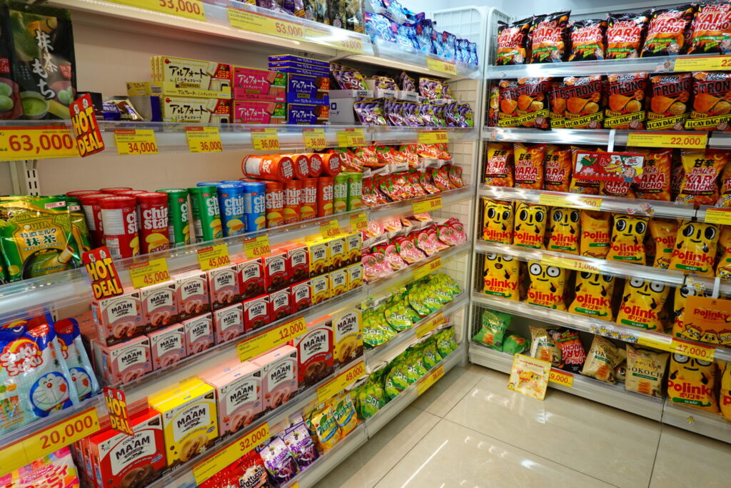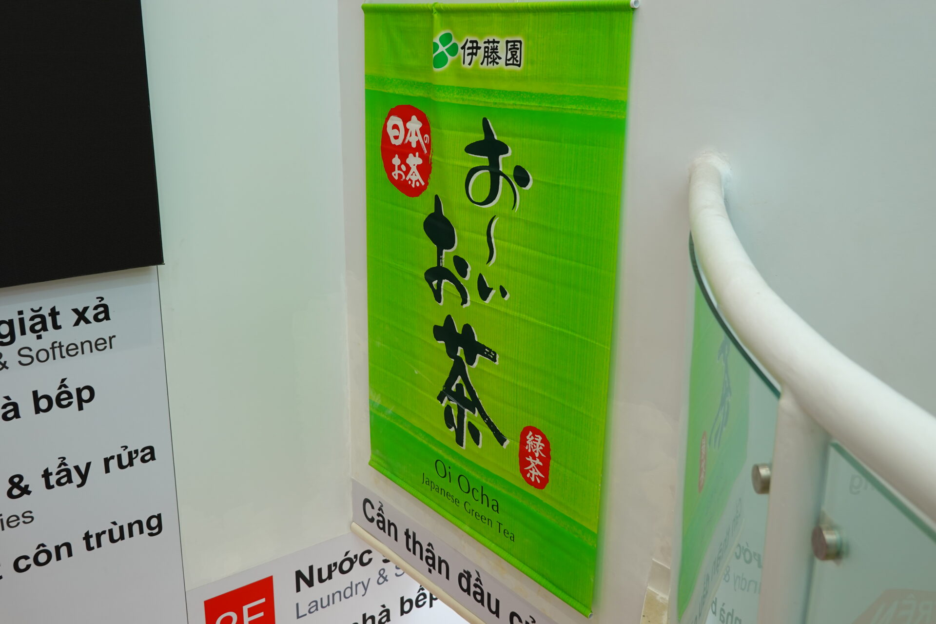 中2階は「プロモーションエリア」とのこと。このときは日本のお菓子が並んでいました。日本からの輸入品に加え、湖池屋のベトナム製造スナックや、最近現地製造を始めたばかりのカントリーマアムまで。