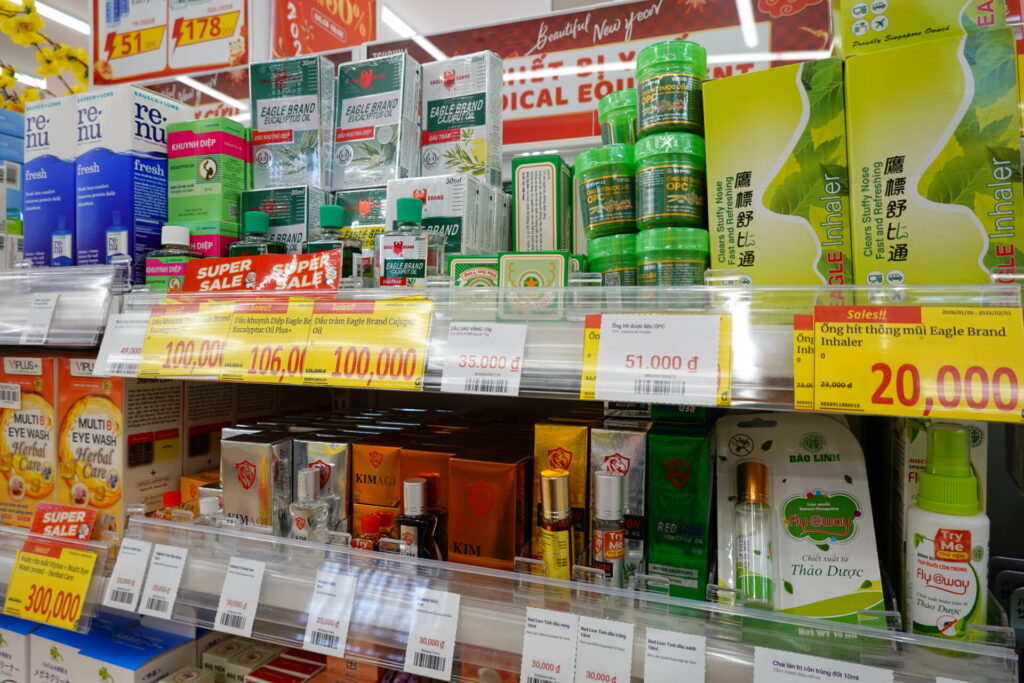黄金星バームやイーグルオイルなど、ベトナム伝統のケア用品も手に入ります。