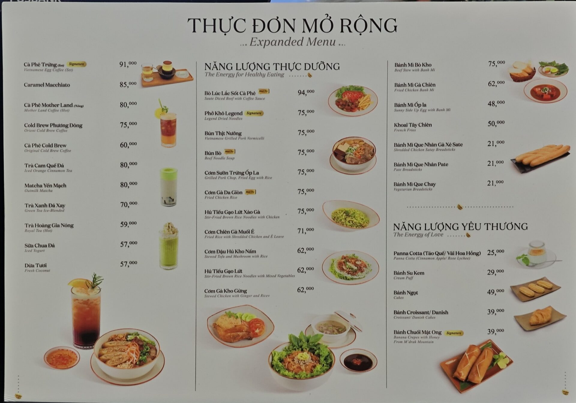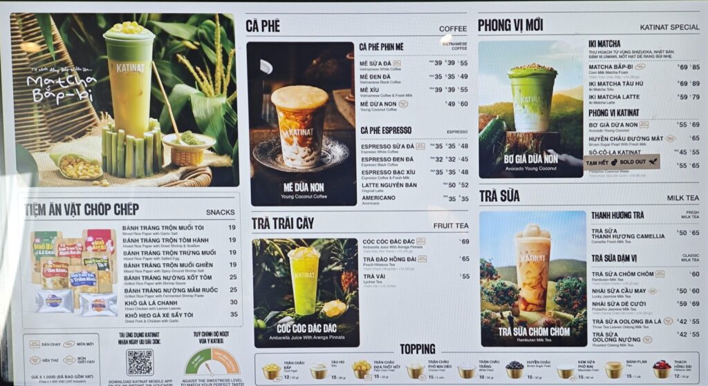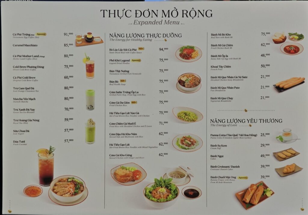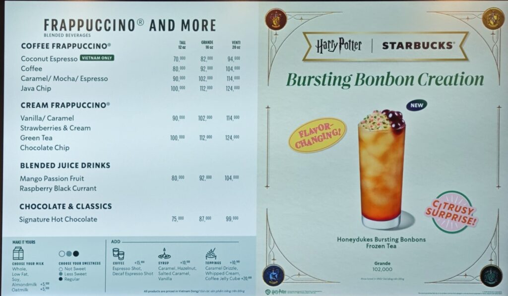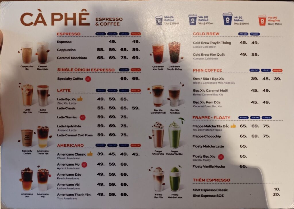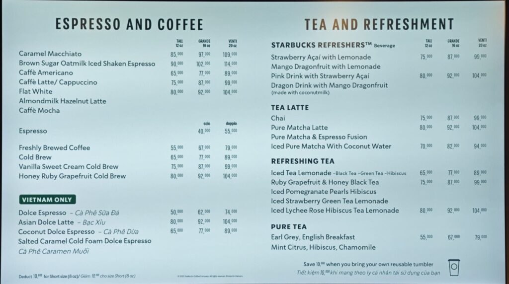 メニューは日本でもおなじみフラペチーノやエスプレッソ飲料を中心に構成されており、ボリュームゾーンは1杯70,000ドンから120,000ドン程度とベトナムの主要カフェチェーンの中では最も高い価格帯に位置。