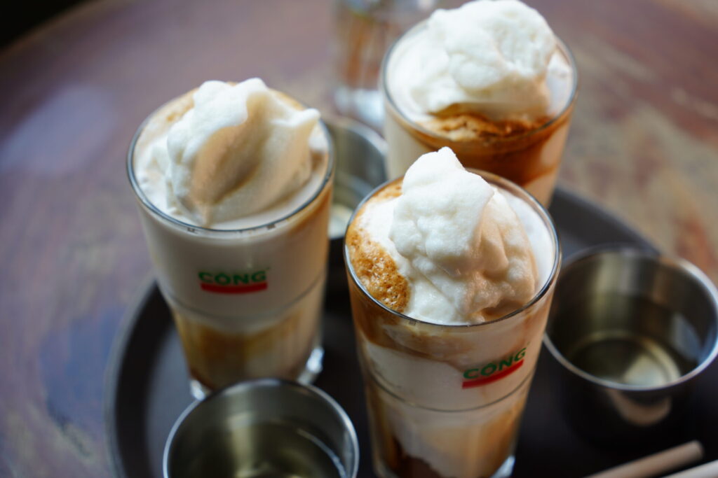 ブランドを象徴する圧倒的なヒット商品は「Cốt Dừa Cà Phê(ココナッツ・コーヒー)」。濃厚ココナッツスムージーと力強いコーヒーが調和したこのドリンクはマストトライ。