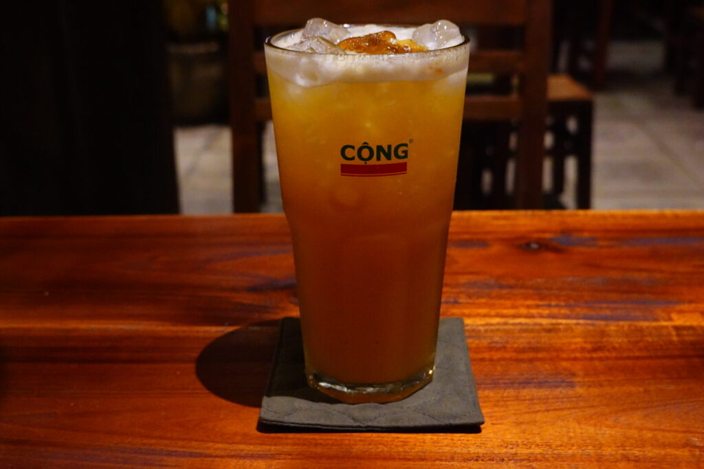 私が訪れた店舗にはフルーツティーやスムージーなどもありました。コーヒーが飲めないので助かった。濃ゆ〜い蓮茶もまたベトナムらしい。