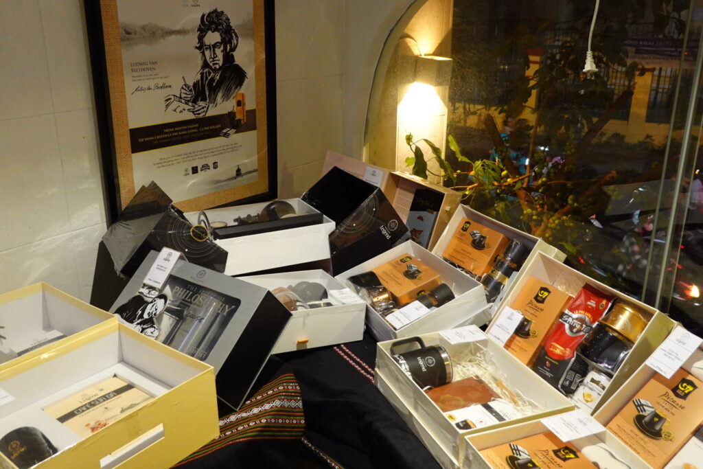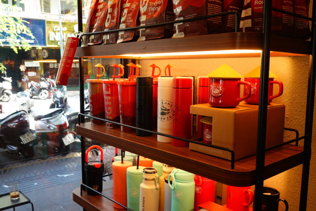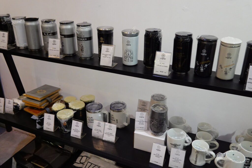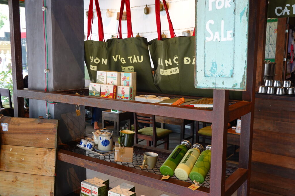 店舗ではノンラー(ベトナムの伝統的な笠)をモチーフにした蓋付きのタンブラーや、オリジナルコーヒー豆などの物販も行われており、多角的な展開が伺えます。お土産にどうぞ。