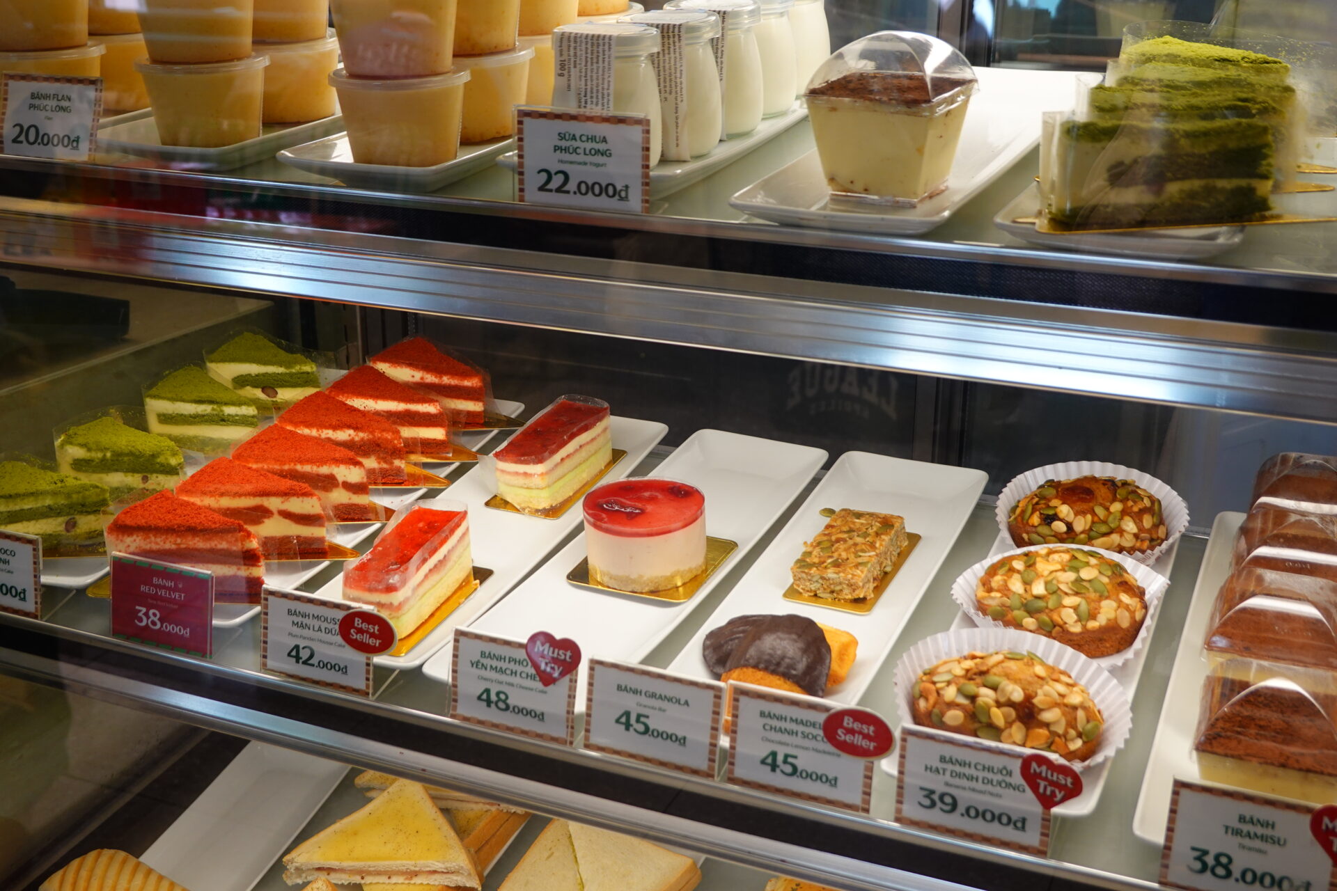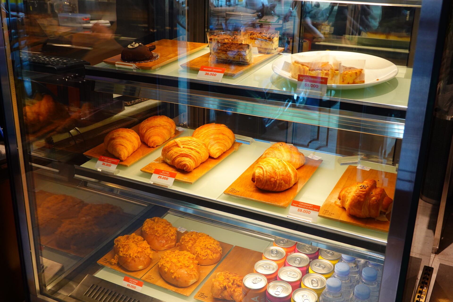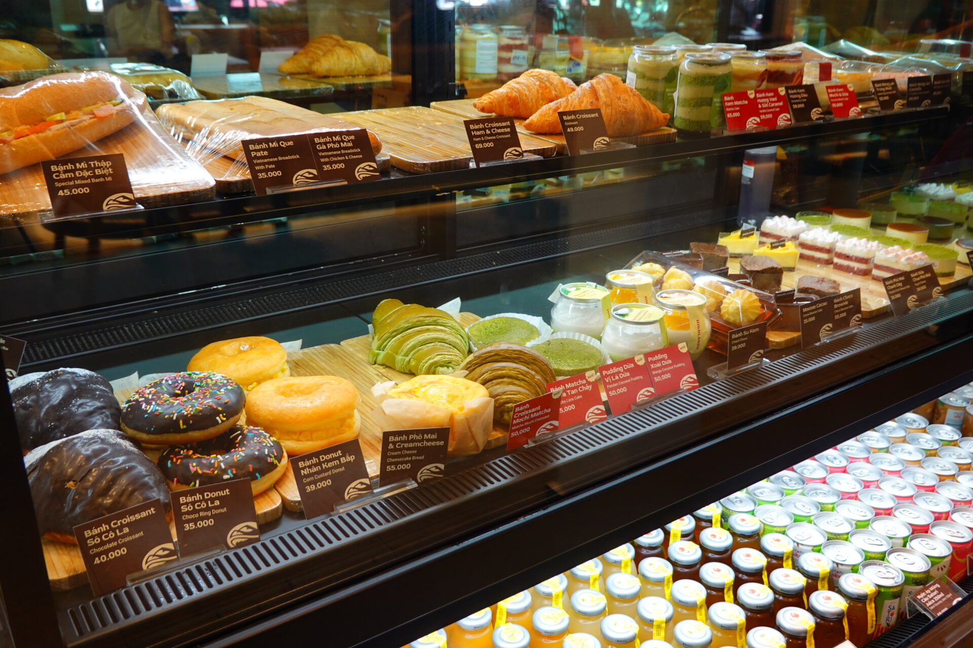 フードメニューも充実しており、手軽なバインミーだけでなく、ショーケースには抹茶のモチケーキやチョコレートドーナツ、各種ケーキが並びます