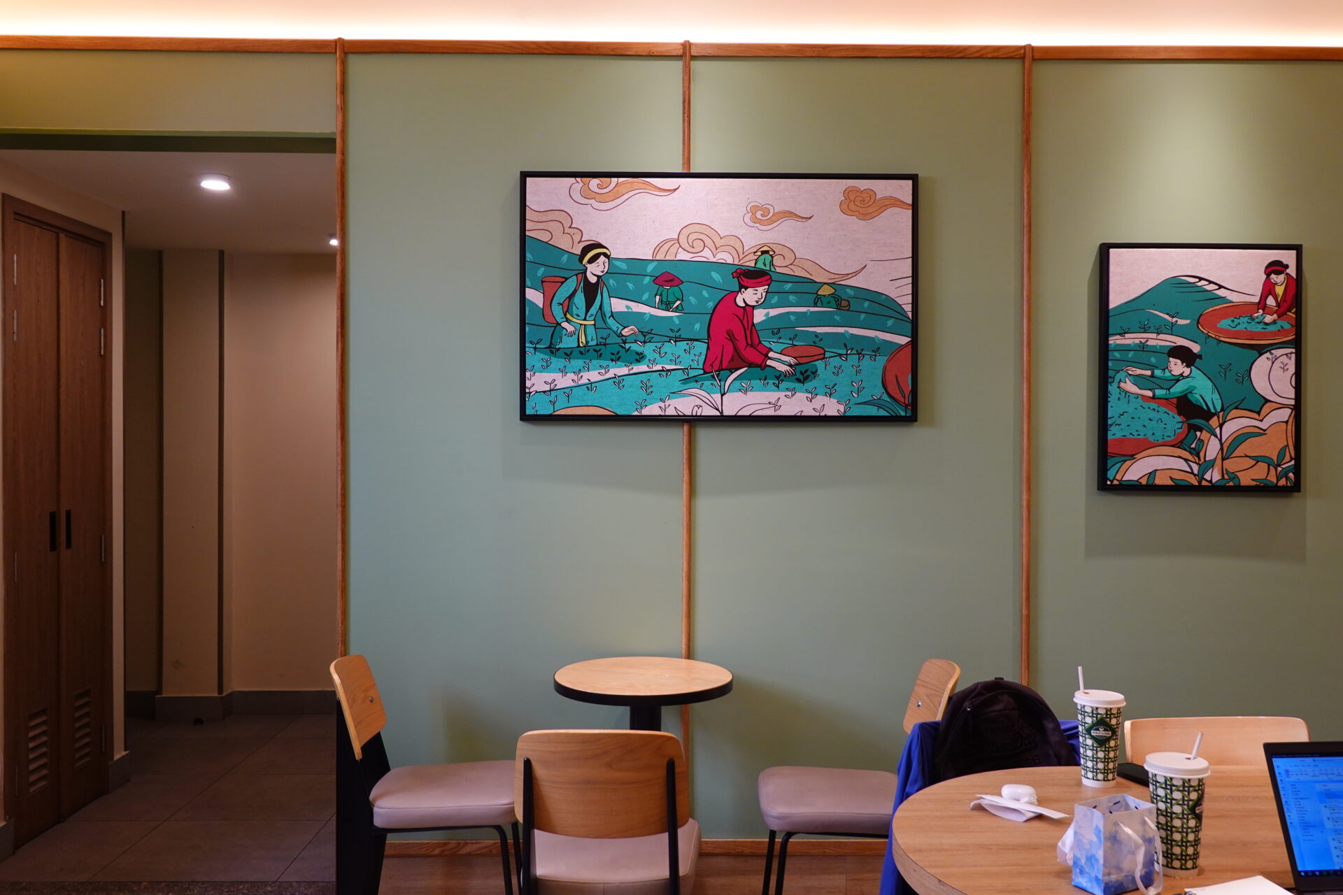 店舗デザインはブランドカラーである深いグリーンを基調としており、上述の旗艦店の店内には茶摘みの風景を描いた画が飾られるなど、モダンな中にも歴史を感じさせる落ち着いた空間が広がっています。