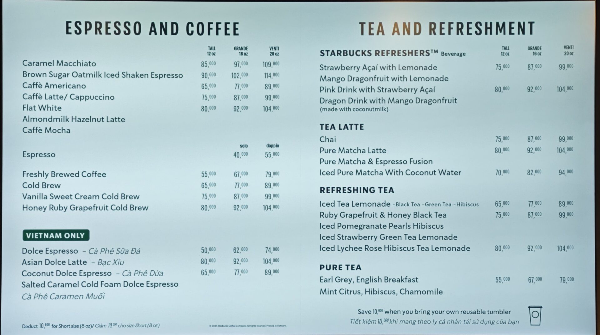 一方で、ベトナム市場への適応も進めており、メニュー内にはVietnam Only(ベトナム限定)のセクションが設けられています。ここでは、伝統的なミルクコーヒーを意識したDolce Espresso(ドルチェ・エスプレッソ)や、ココナッツを使用したメニューなど、現地の嗜好に合わせたラインナップが用意されています。