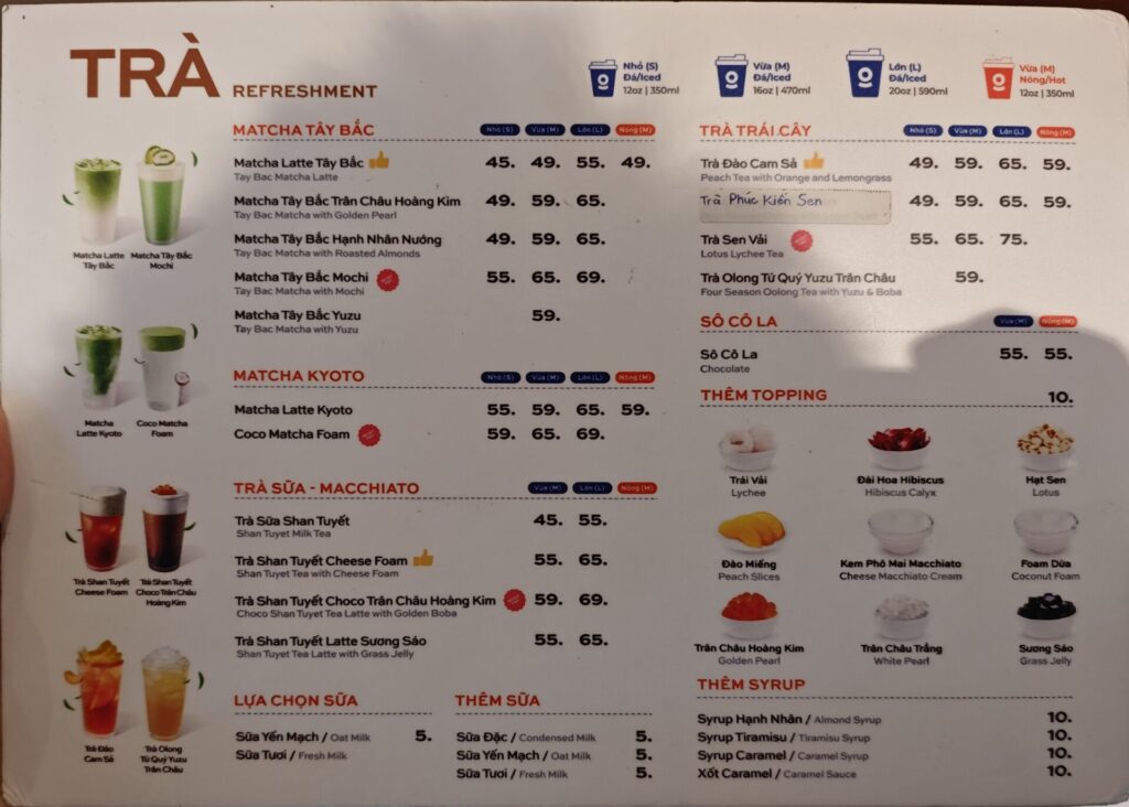 直近のトレンドを象徴しているのが、お茶カテゴリーの充実。ベトナム北西部の素材を使用したMatcha Tây Bắc(西北抹茶)や、希少なShan Tuyết(シャン・テュエット/山雪)茶を使用したラテが大きく取り上げられています。