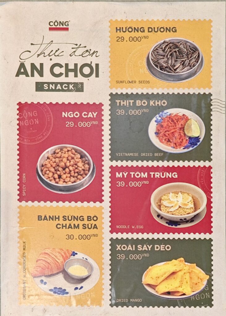 他のチェーン店ではあまり見られないユニークな軽食にも注目。ひまわりの種やドライマンゴー、さらにはゆで卵や卵入りのインスタントラーメン(Mỳ Tôm Trứng)まで。